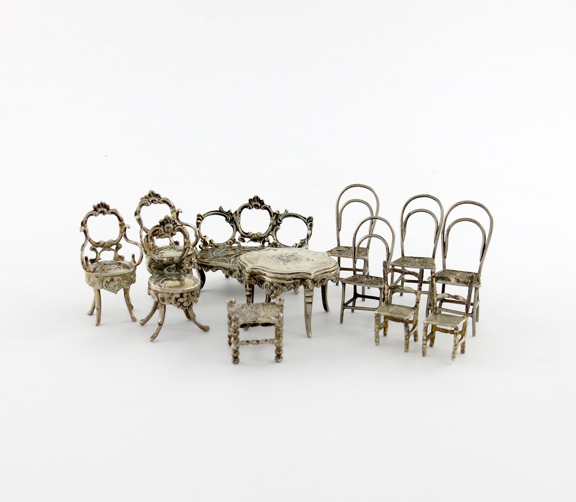 comprising: a late 19th century settee and two chairs, a table, a stool, a matched set of four chairs, plus three single chairs, approx. weight 4.2oz. (12)