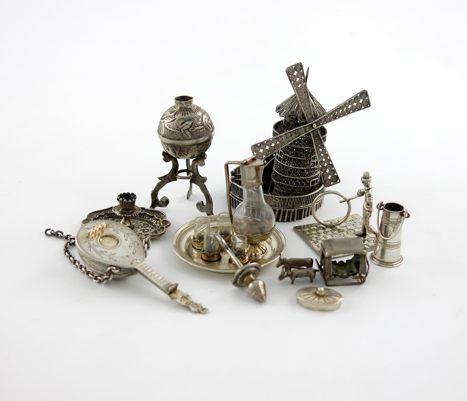 A collection of miniature silver items,