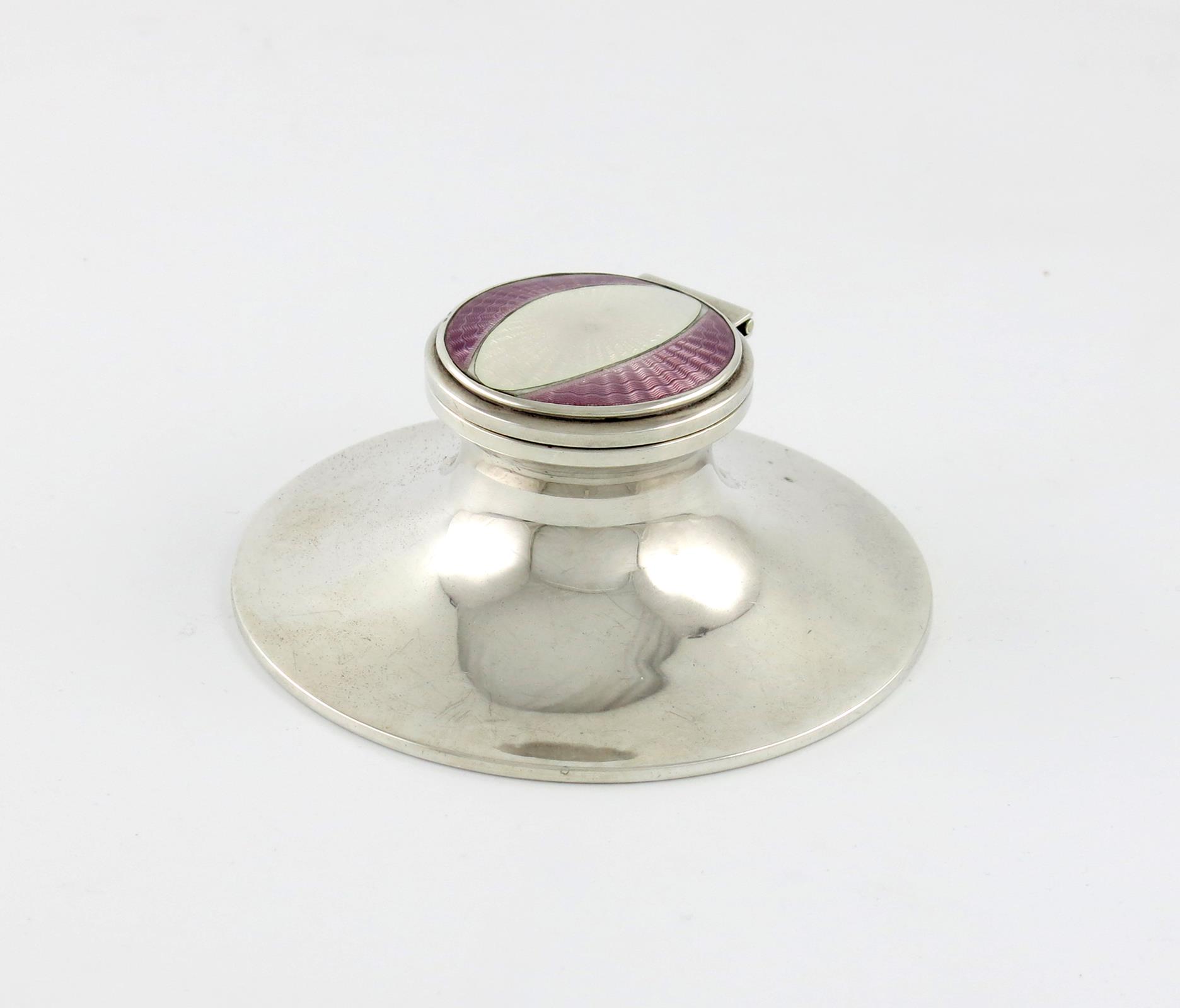 circular capstan form, the hinged cover with purple and white enamel decoration, diameter of base 12.5cm.