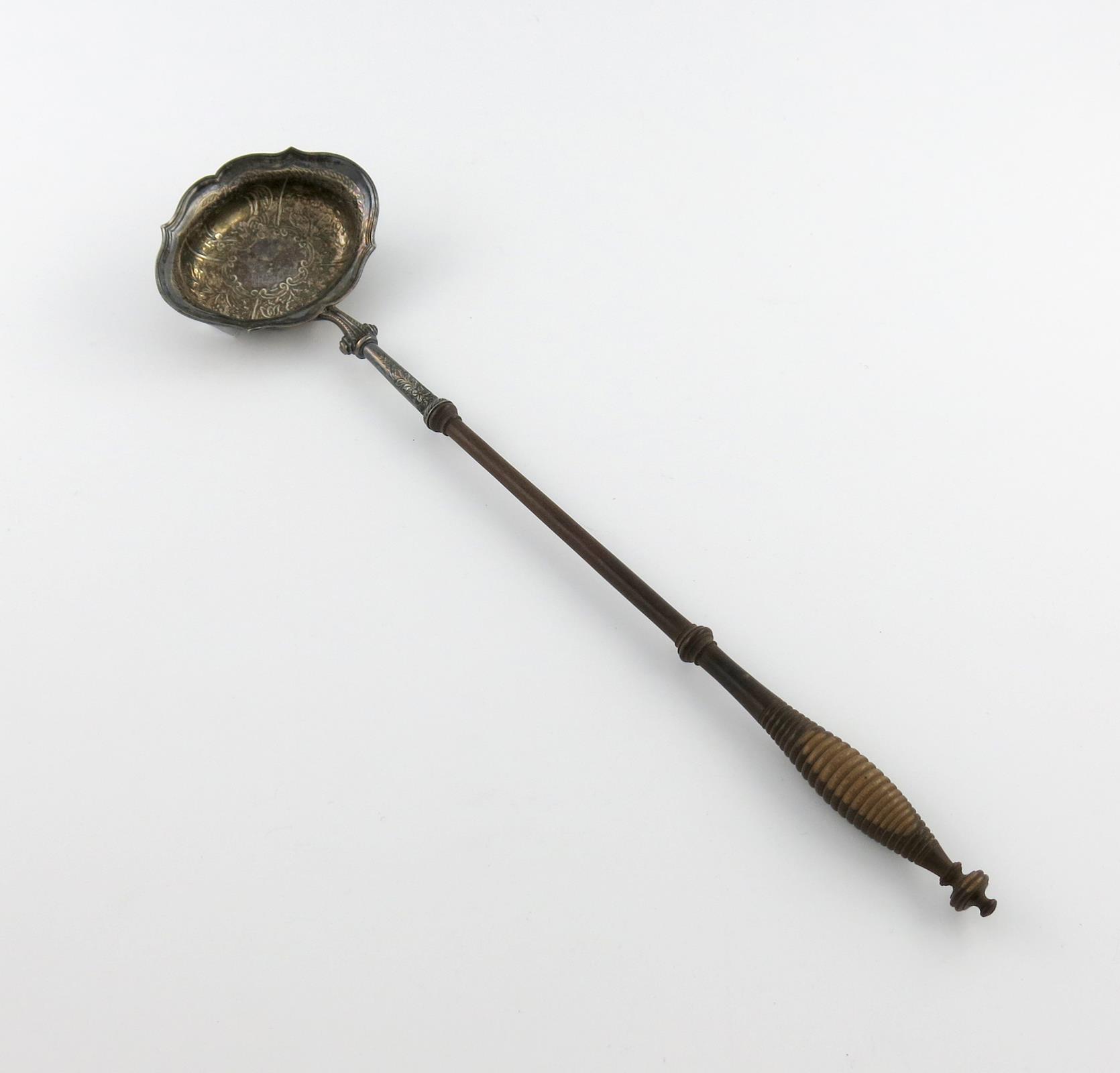 lobed oval form, chased foliate decoration, on a matted background, moulded border, engraved with a coronet, turned baluster wooden handle, length 39.5cm.