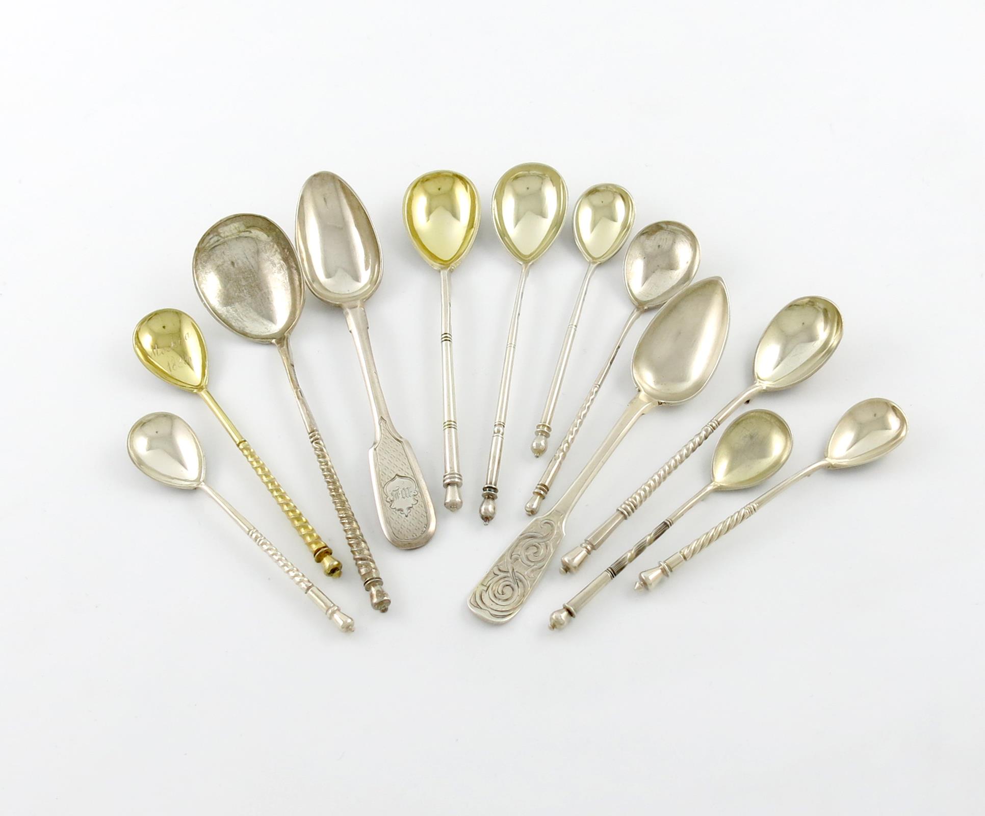 including a silver-gilt and niello work teaspoon, the reverse of the bowl with an architectural scene, plus two others with niello decoration, and others with engraved foliate scroll decoration, approx. weight 8.5oz. (12)