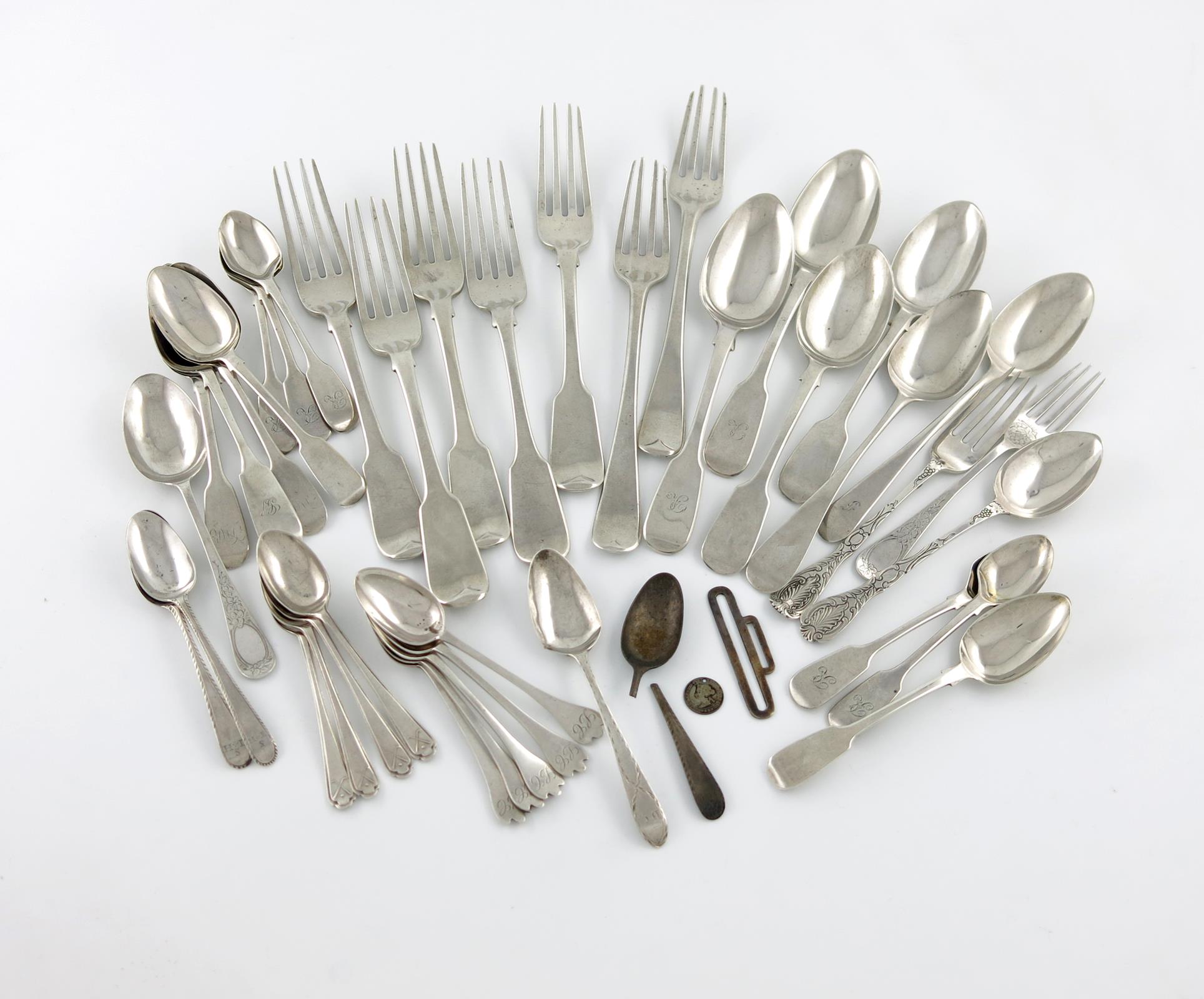 comprising seven table forks, six dessert spoons, five egg spoons, and various spoons, approx. weight 36oz. (qty)