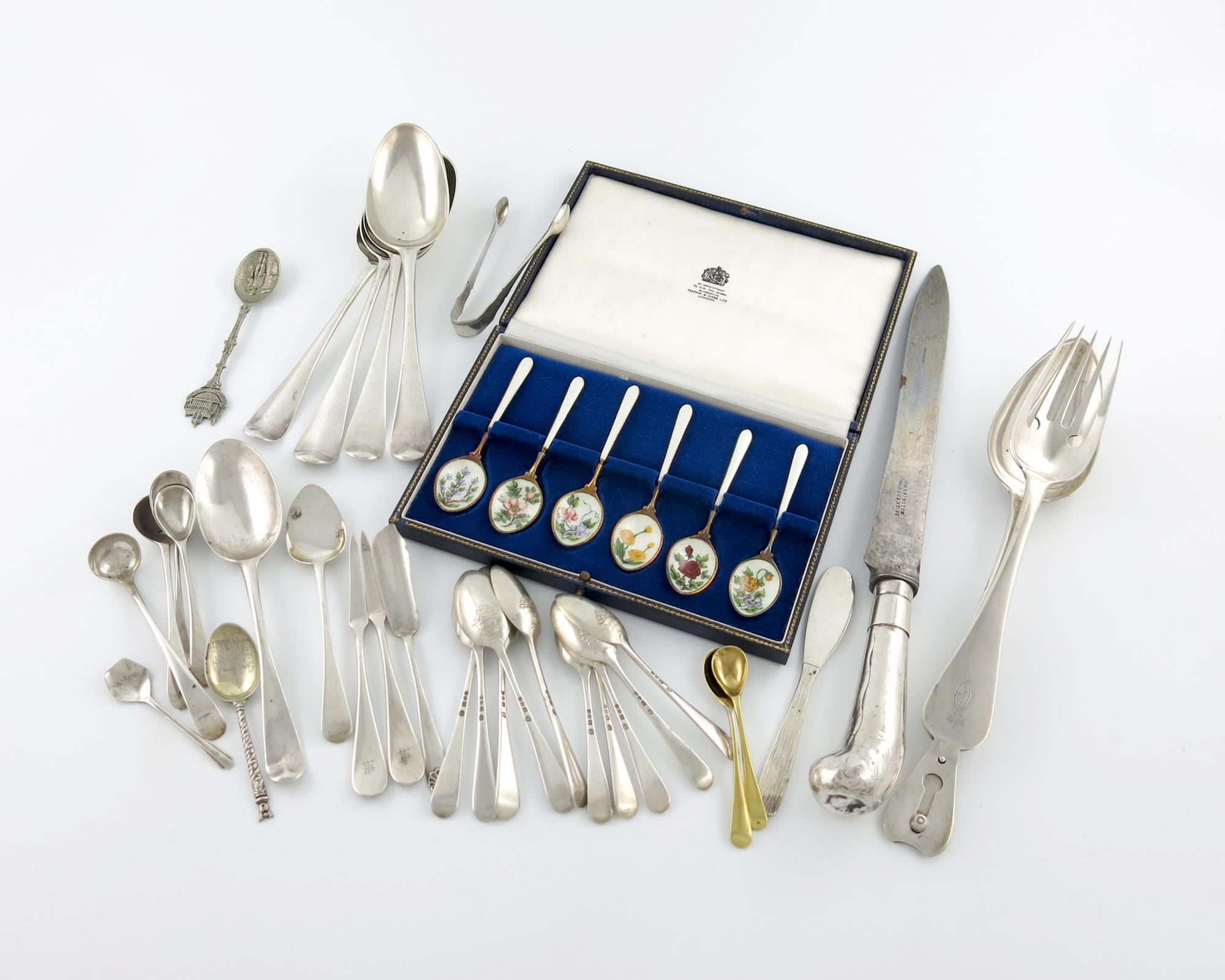 comprising: four Hanoverian pattern tablespoons, a cased set of six silver-gilt and enamel teaspoons, decorated with flowers, London 1967, a Dutch serving fork and spoon, six picture-back teaspoons and six coffee spoons, a modern butter knife by Brian Fuller, a dessert spoon, plus other items including a dessert spoon, a knife, and condiment spoons, approx. weight 23oz. (qty)