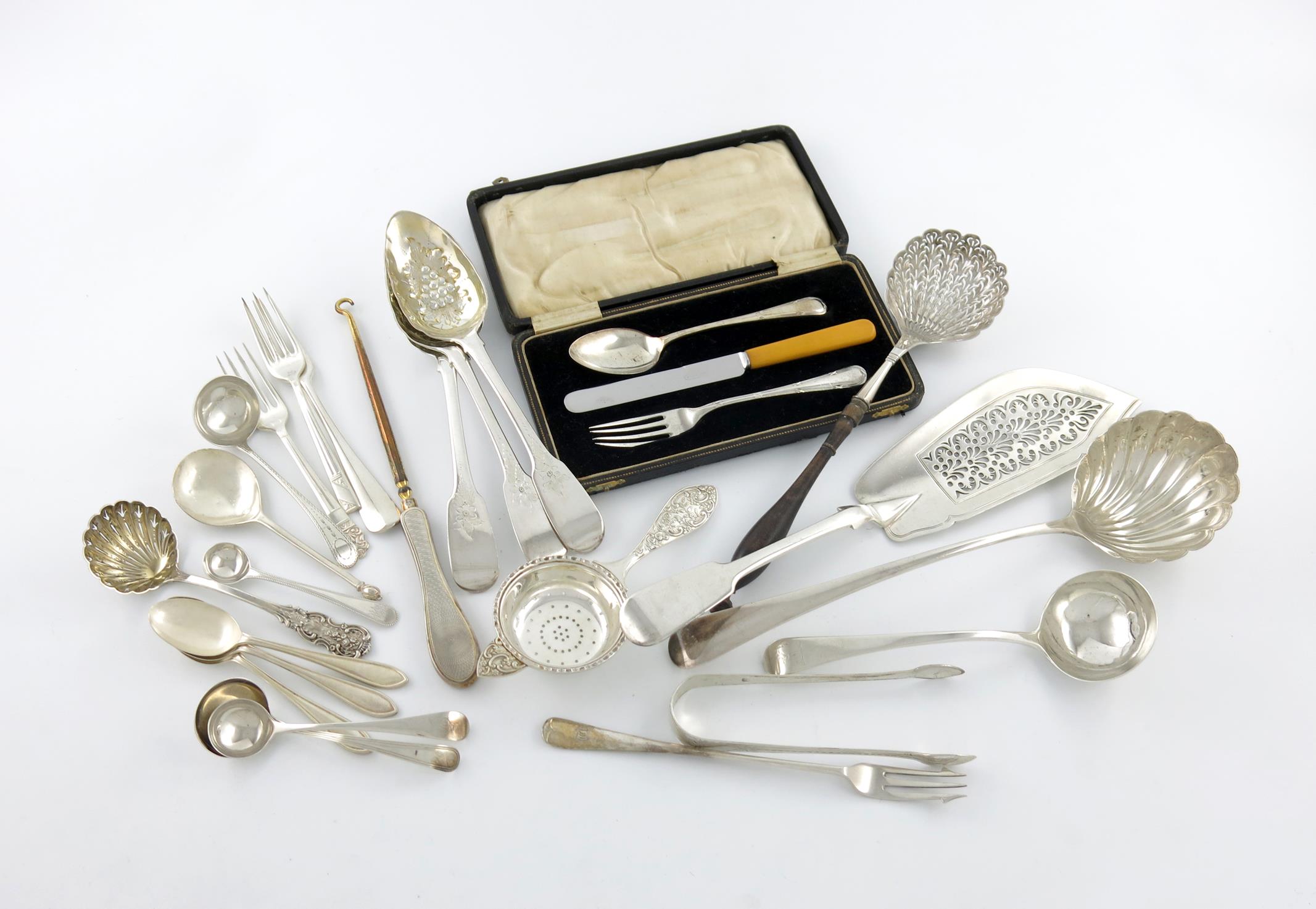 comprising: a small soup ladle, a French sifting spoon, another sifting spoon, a fish slice, three tablespoons, a sauce ladle, a tea strainer, four forks, two cream ladles, a pair of sugar tongs, and other items including a cased three-piece christening set, approx. weight 30oz. (qty)