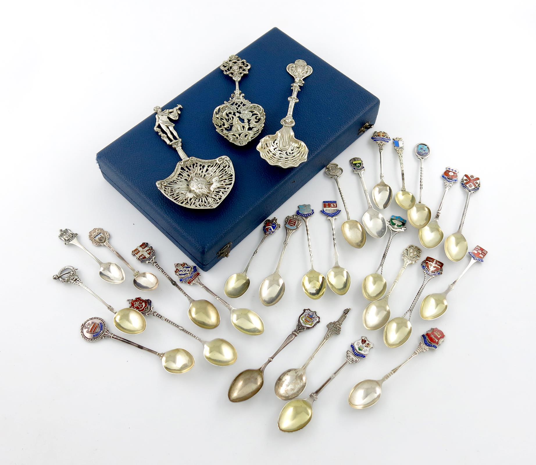 comprising: three pierced sifting spoons and various silver and enamel souvenir spoons, approx. weight 14oz. (qty)