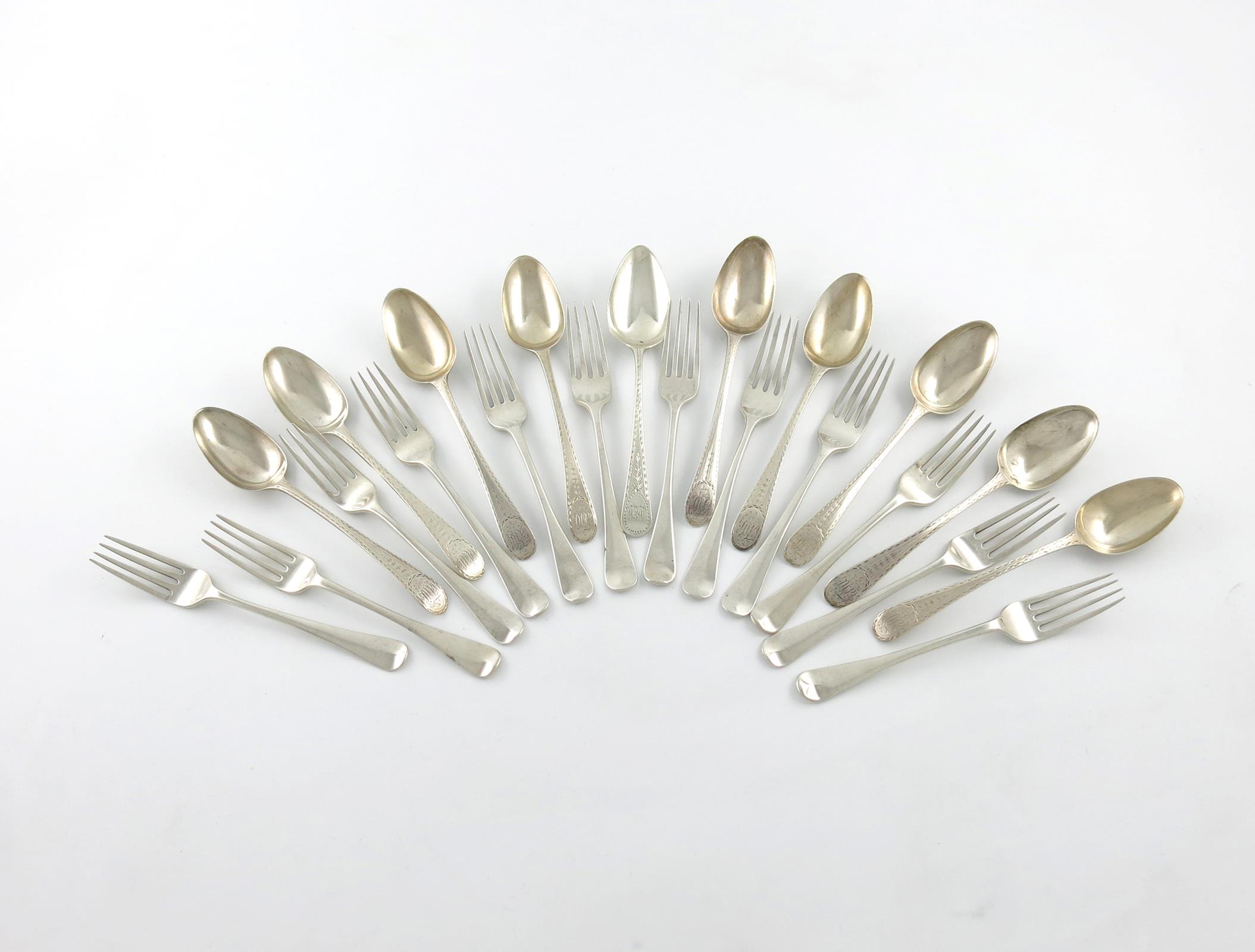 comprising ten Bright-cut dessert spoons, the terminal with a monogram, plus twelve dessert forks, approx. weight 25oz. (22)