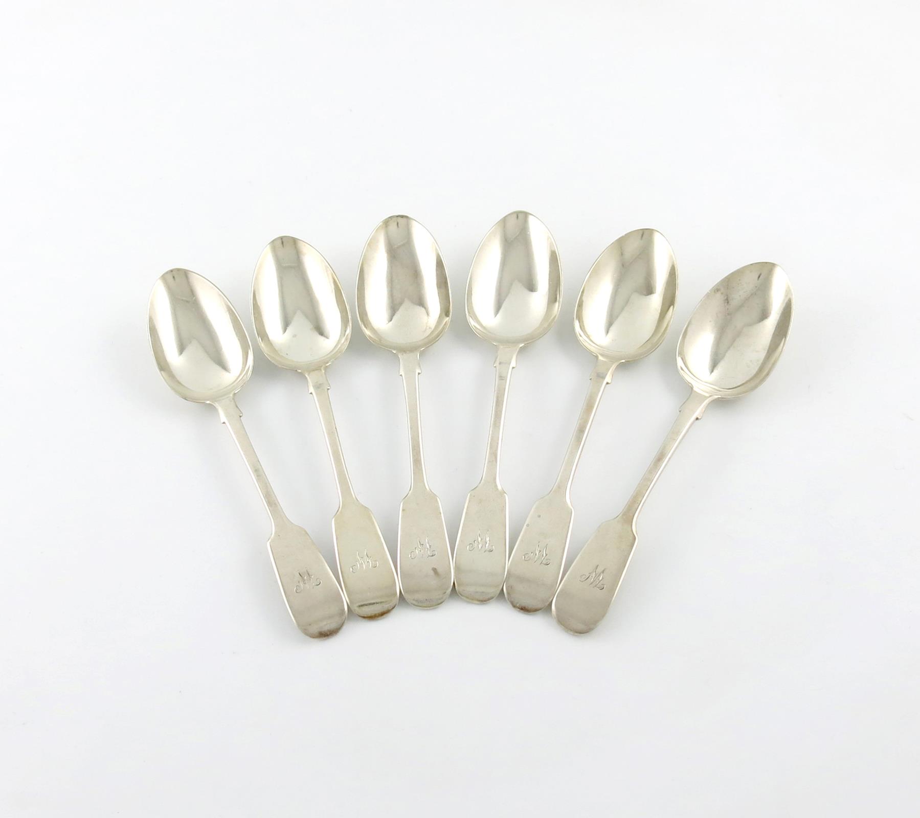 A set of six Victorian silver Fiddle pattern dessert spoons,
