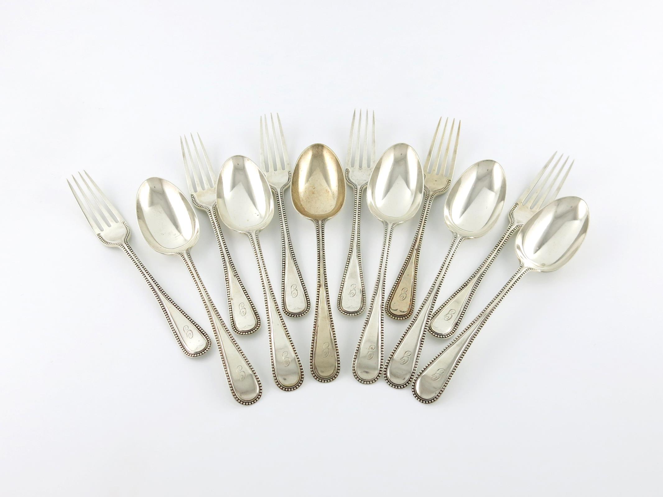 An Edwardian set of six Bead pattern table forks and six tablespoons
