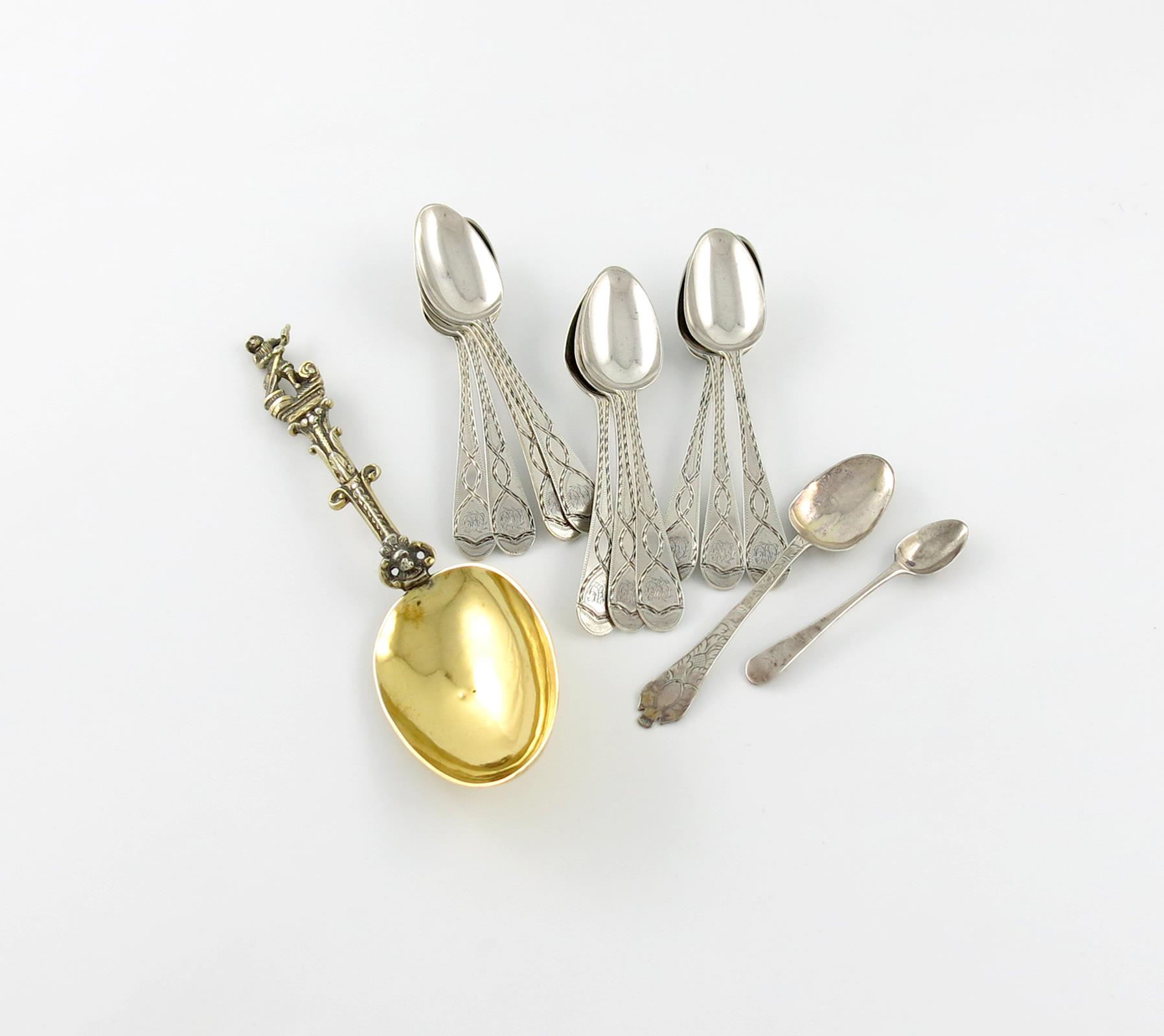 comprising a late 17th / early 18th century teaspoon, with engraved decoration, circa 1700, a set of ten George III Bright-cut teaspoons, by John Lambe, London circa 1780, a silver-gilt Dutch spoon and a miniature/snuff spoon, approx. weight 5.7oz. (13)