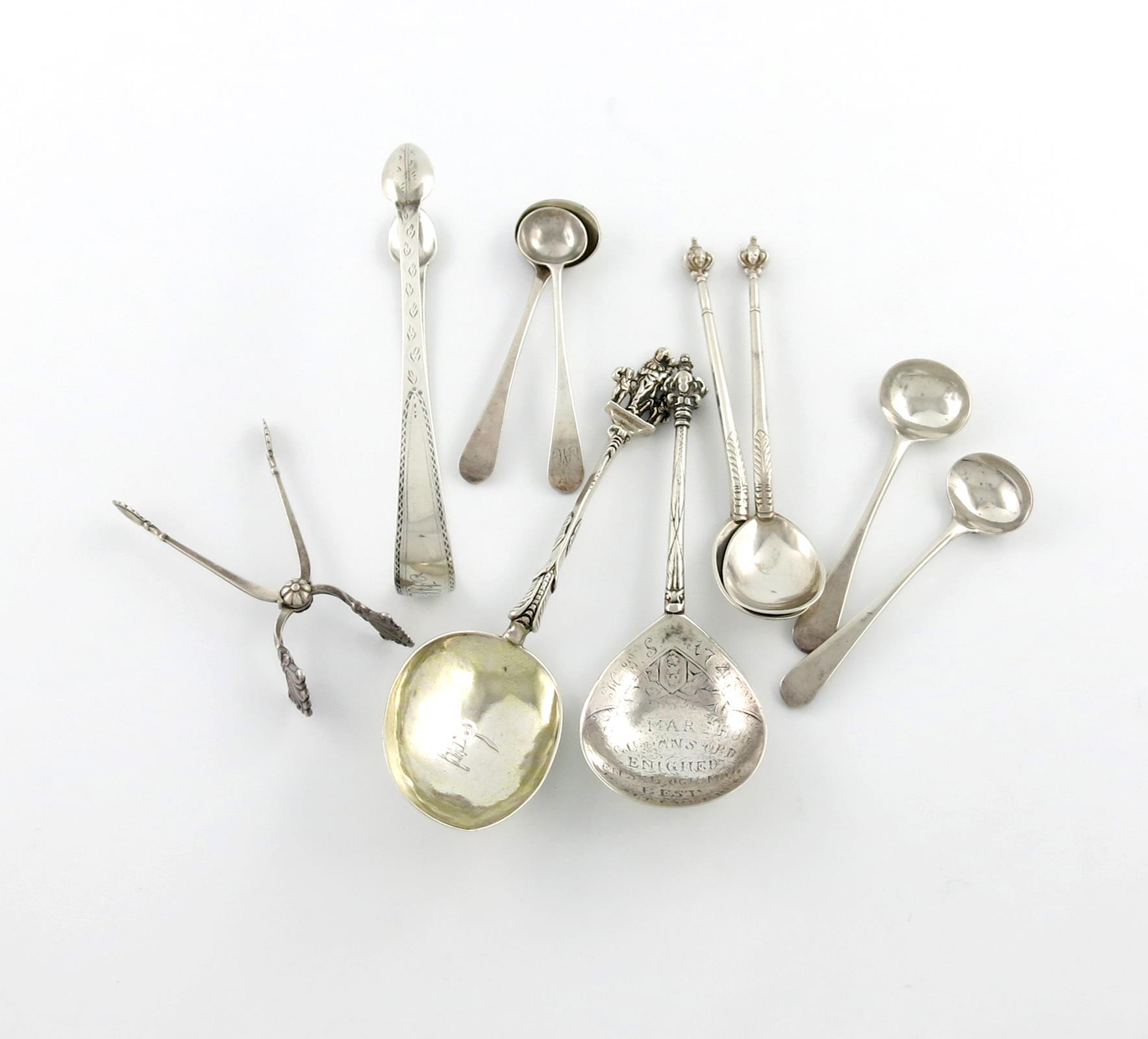 comprising: an 18th century Dutch spoon, with a figural terminal of Mary with Jesus, the reverse of the bowl initialled, the front of the bowl with a crest, a pair of sugar tongs, three continental spoons, four salt spoons and a pair of sugar tongs, approx. weight 7oz. (qty)