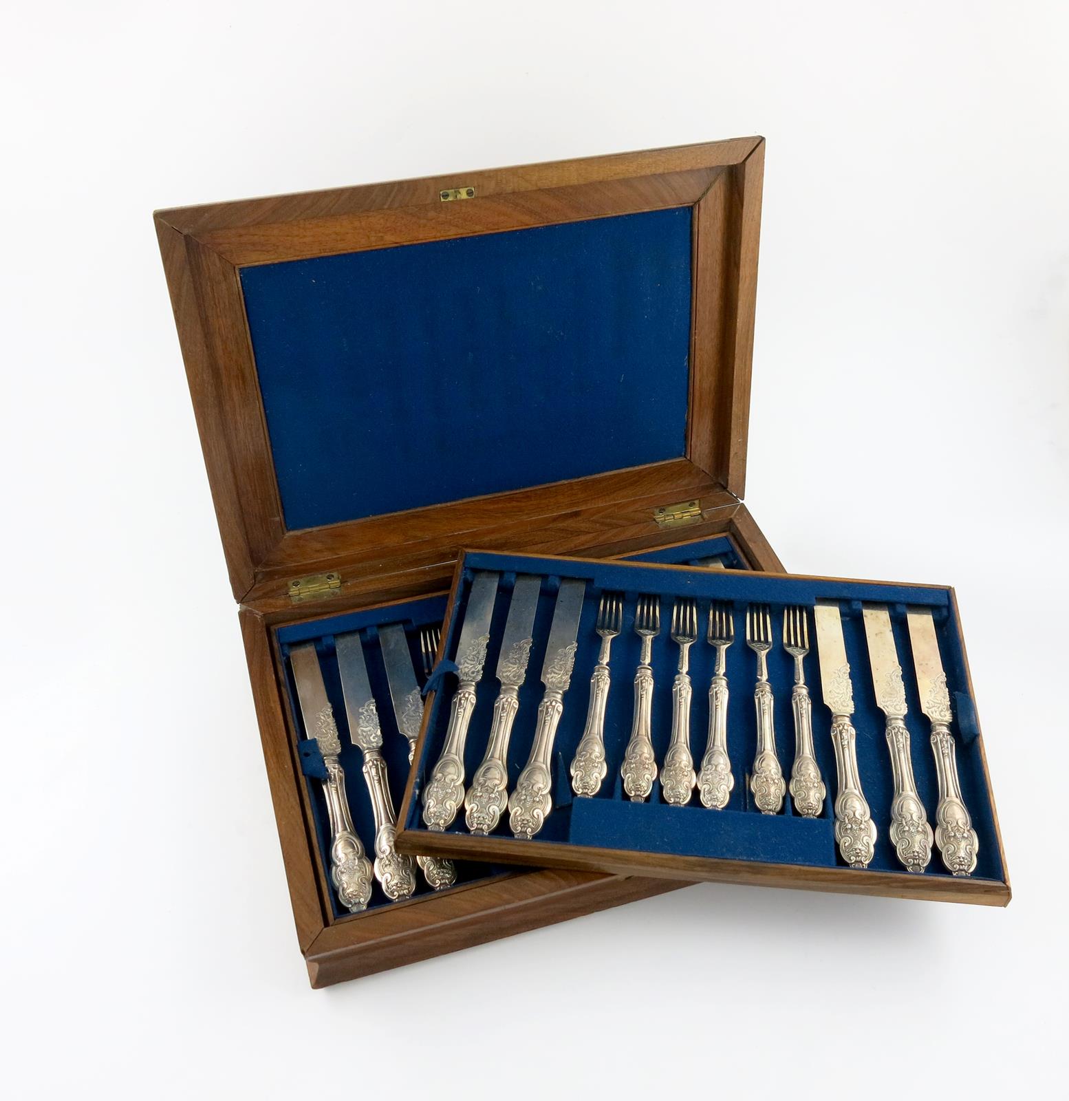 with foliate handles, the blades engraved with a mask and foliate scrolls, in a fitted wooden case.