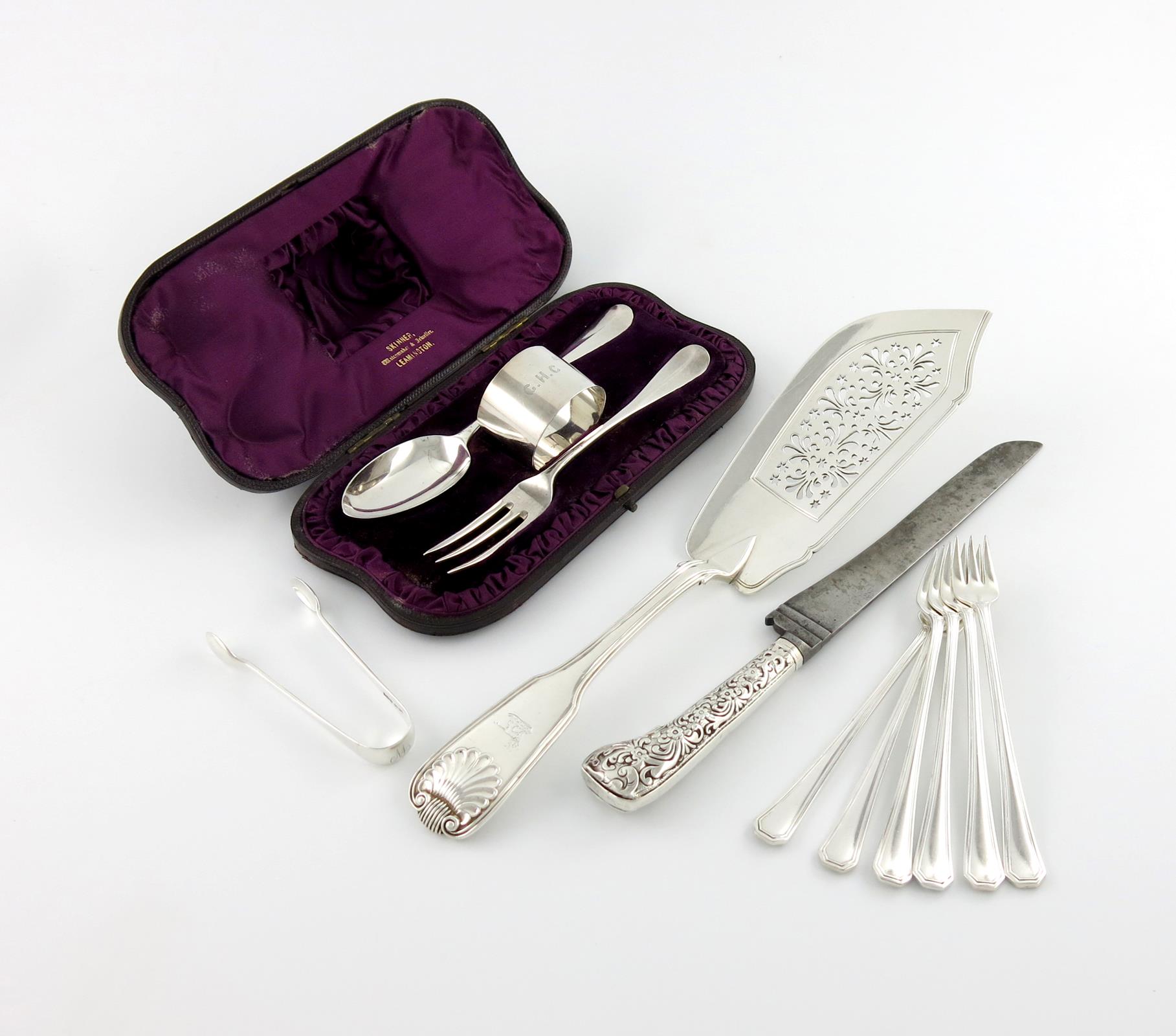 comprising: a William IV Fiddle, Thread and Shell pattern fish slice, by George Adams, London 1836, a set of six American oyster forks, a pair of sugar tongs, a cased fork, spoon and napkin ring, and an unmarked knife, approx. weight 15oz. (qty)