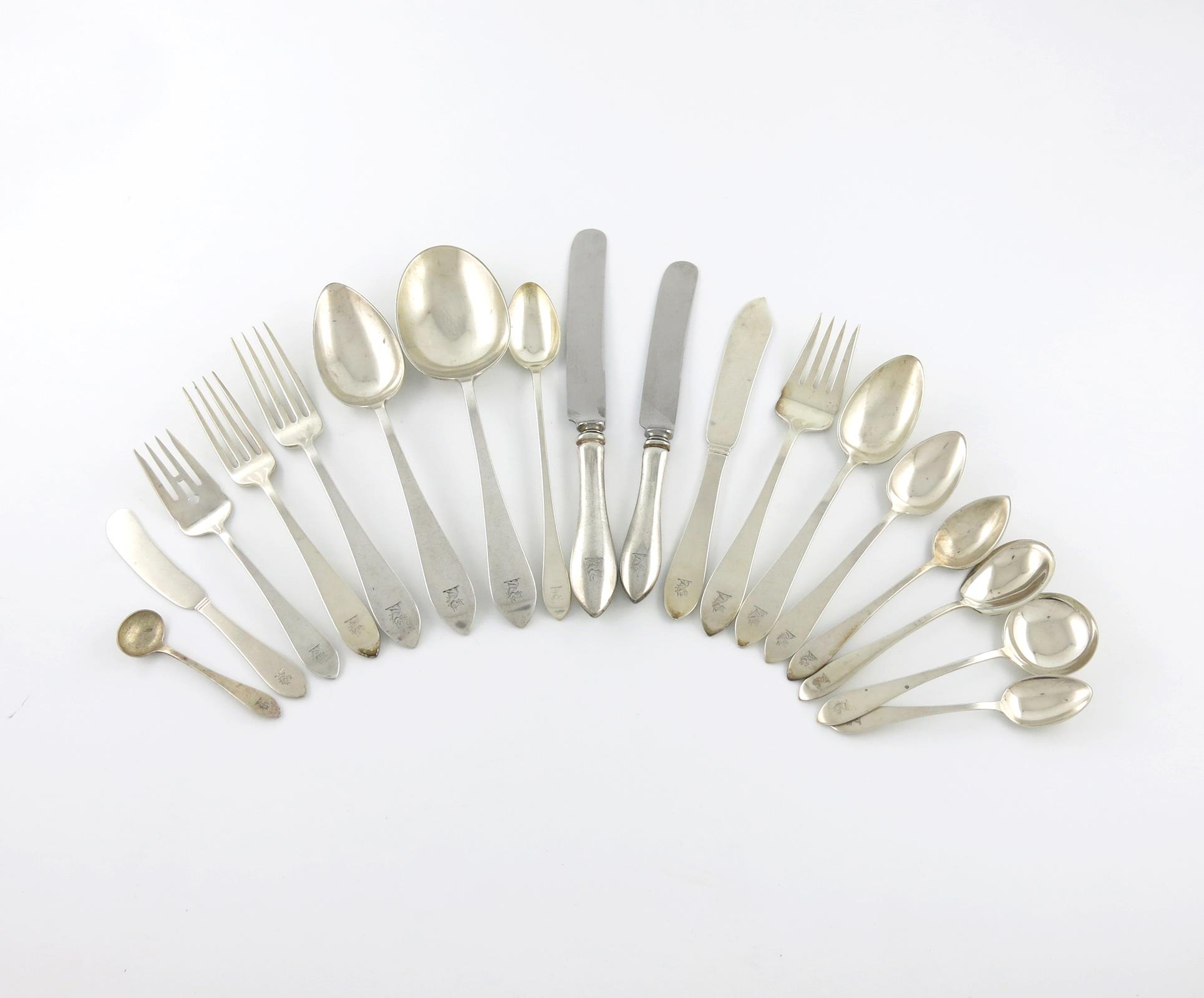 the terminals with a crest, comprising: ten tablespoons, nine table forks, six serving spoons, eight fish forks, eighteen smaller fish forks, eight fish knives, five dessert spoons, eight dessert forks, eighteen teaspoons, five grapefruit spoons, five coffee spoons, nine ice cream spoons, seven sundae spoons, seven butter knives, nineteen small soup spoons/ fruit spoons, a salt spoon, plus some knives, approx. weight 190oz. (qty)