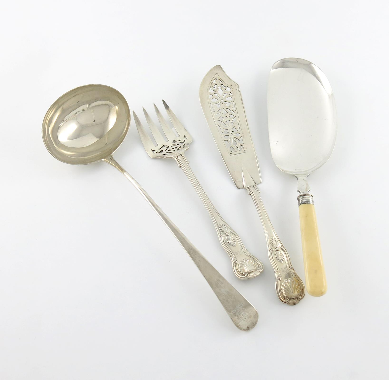 the terminal with a crest, plus a Victorian silver Kings pattern fish knife and fork, by George Adams, London 1861, and a crumb scoop, Sheffield 1921, approx. weight 18oz. (4)