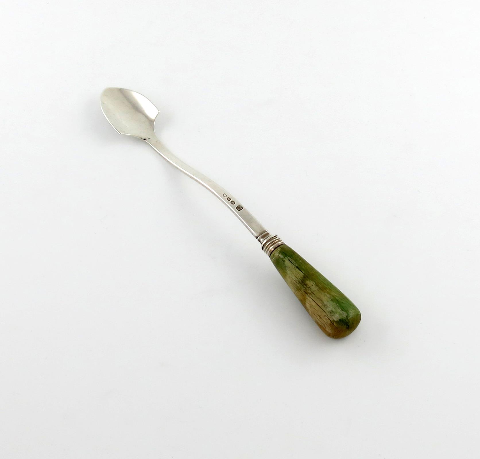 the bowl of spade form, tapering green stained ivory handle, length 25cm.