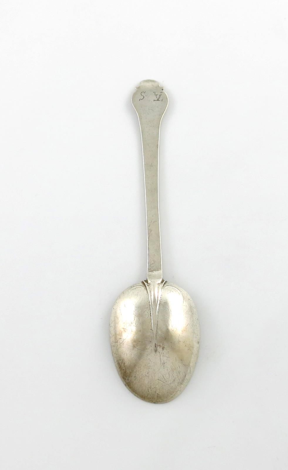 the reverse of the terminal with scratch initials 'S.V', the terminal and the reverse of the bowl with worn scroll decoration length 18.8cm, approx. weight 1.3oz.