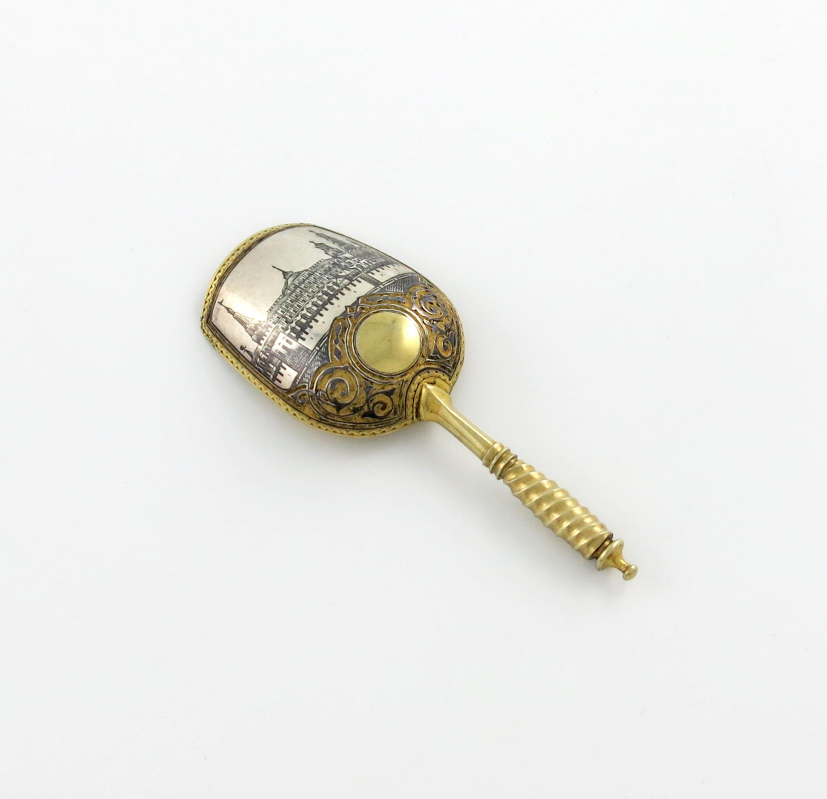 shovel form, the reverse of the bowl with a Moscow architectural scene on a silver background, twisted handle, length 9.1cm, approx. weight 0.7oz.