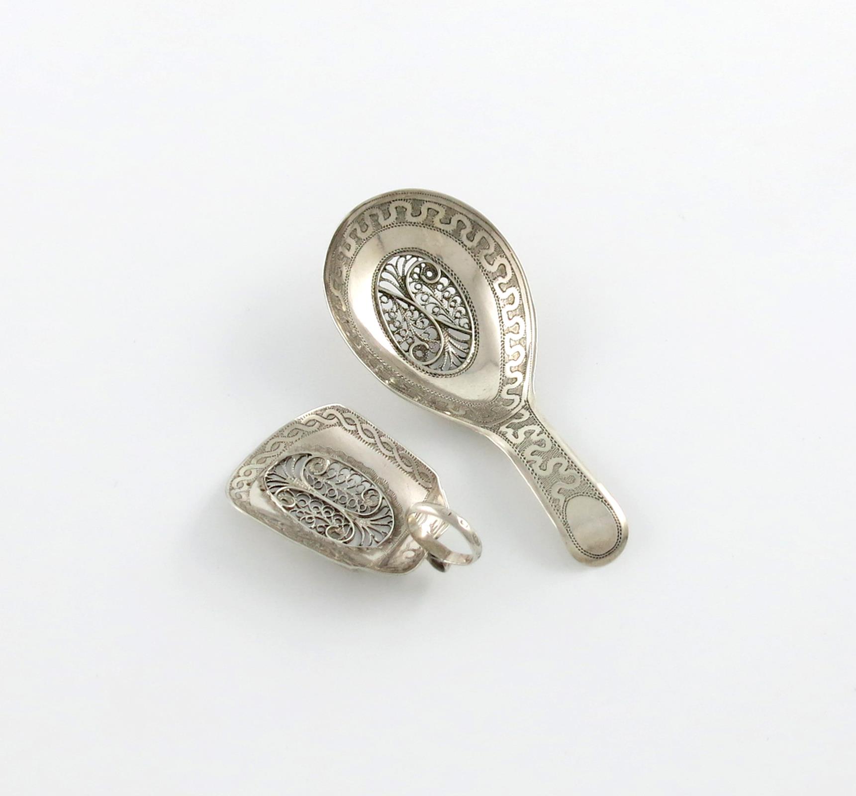 oval bowl, set with an oval filigree panel, engraved wriggle-work decoration, length 8.2cm, plus another silver and filigree caddy spoon by Samuel Pemberton, Birmingham 1807, approx. weight 0.6oz. (2)
