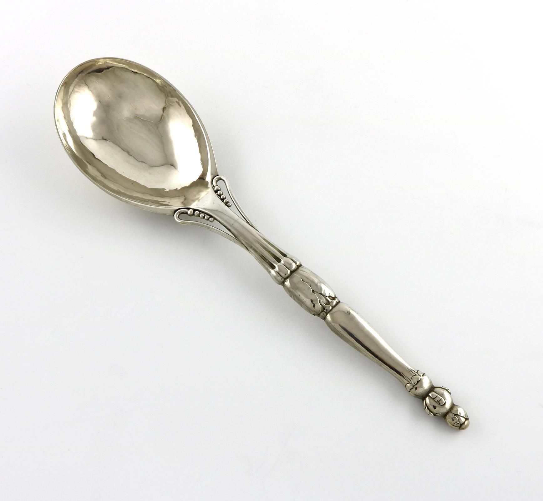 the bowl with pierced scroll and bead decoration, the handle with fluted and foliate decoration, bud final, twisted stem with a foliate ball finial, length 28cm, approx. weight 3.7oz.
