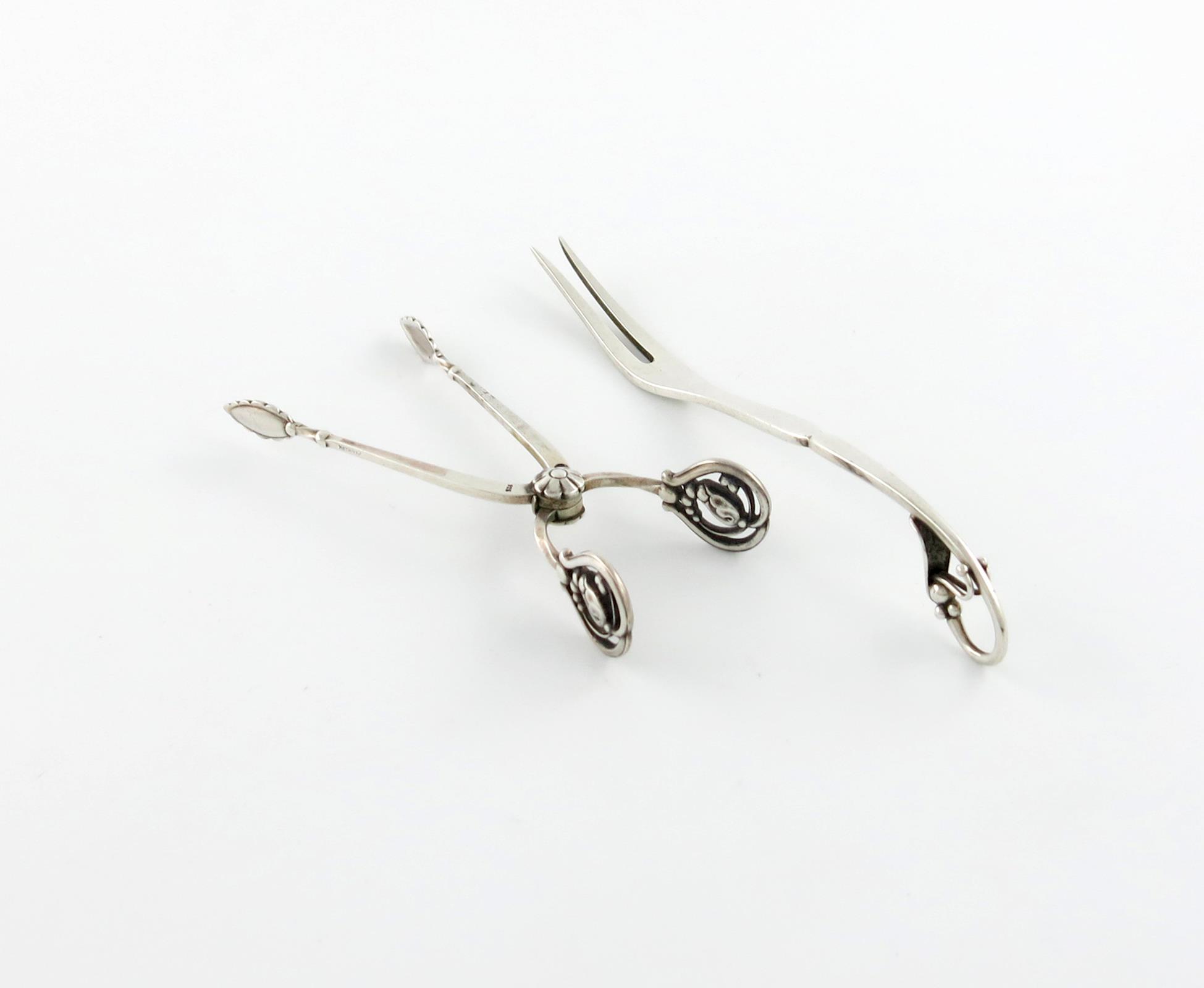design number 21, also with import marks for London 1928, importer's mark of George Stockwell, plus a pair of Georg Jensen sugar tongs, approx. weight 1.3oz. (2)