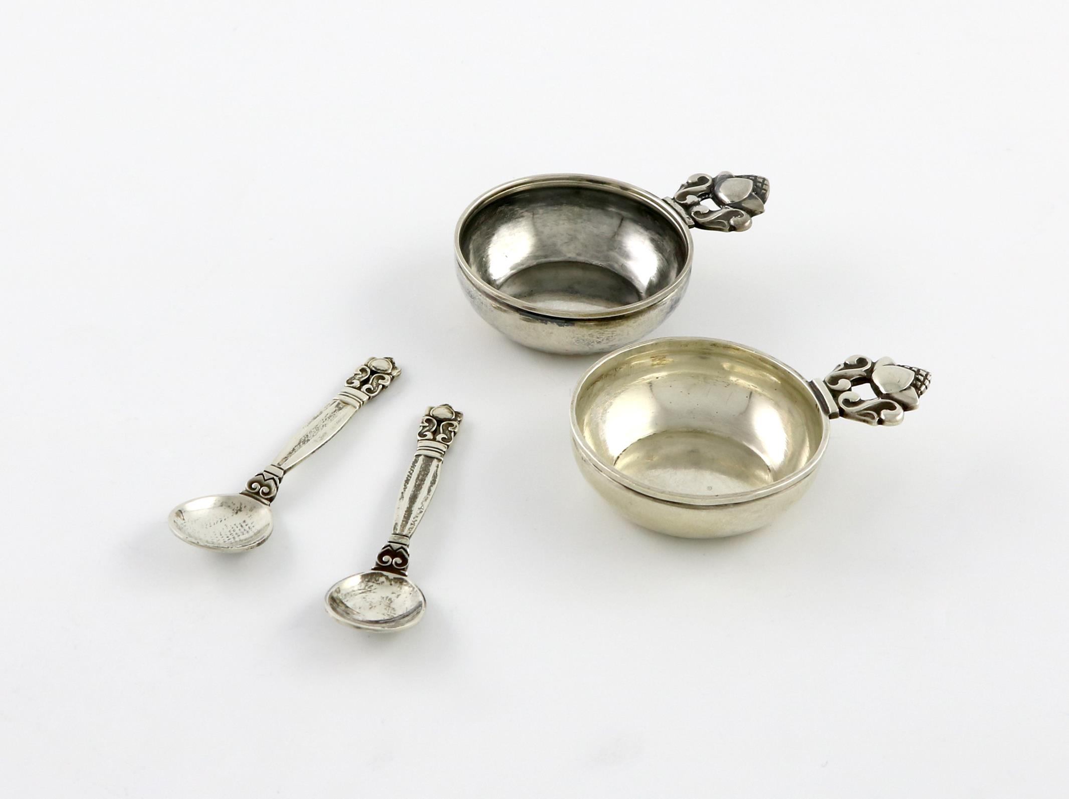 By Georg Jensen, a pair of silver Acorn pattern salt cellars and spoons,