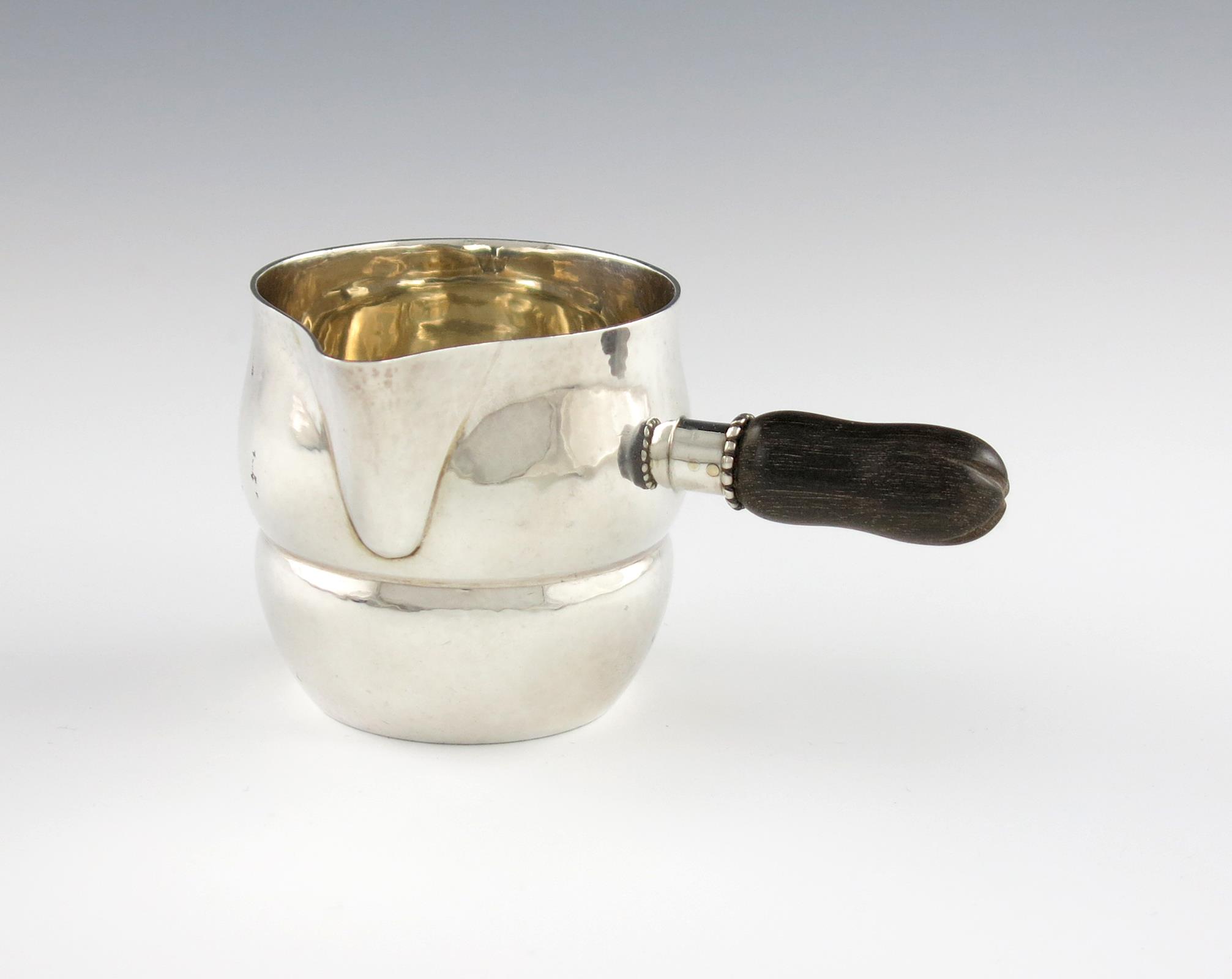 circular form, spot-hammered decoration, wooden side handle with a beaded collar, height 6.3cm, approx. weight 3.5oz.