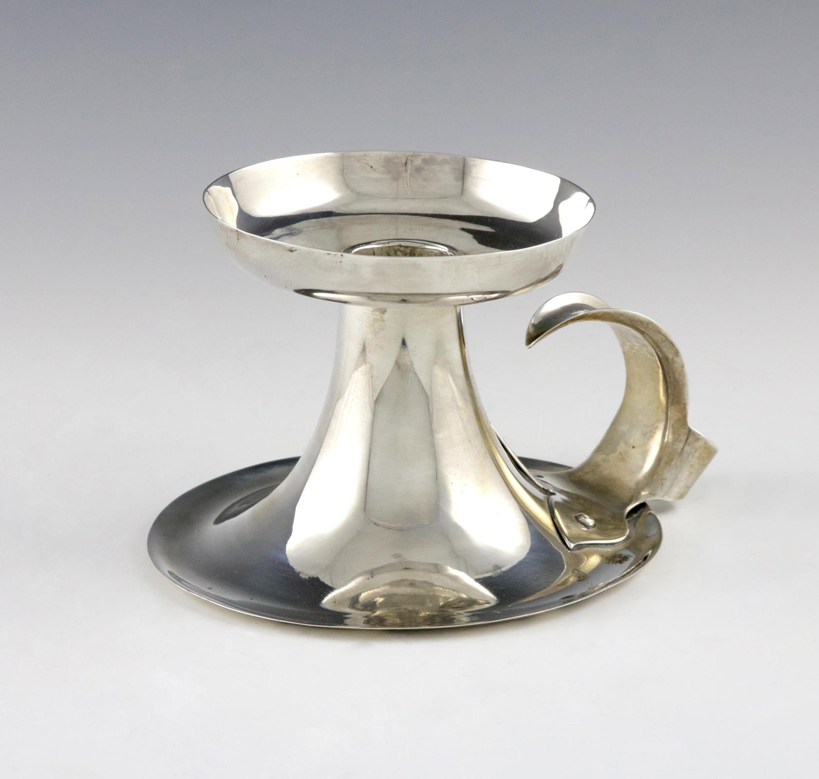 raised circular form, riveted strap work scroll handle, large circular drip pan, height 9cm, approx. weight 8.5oz.