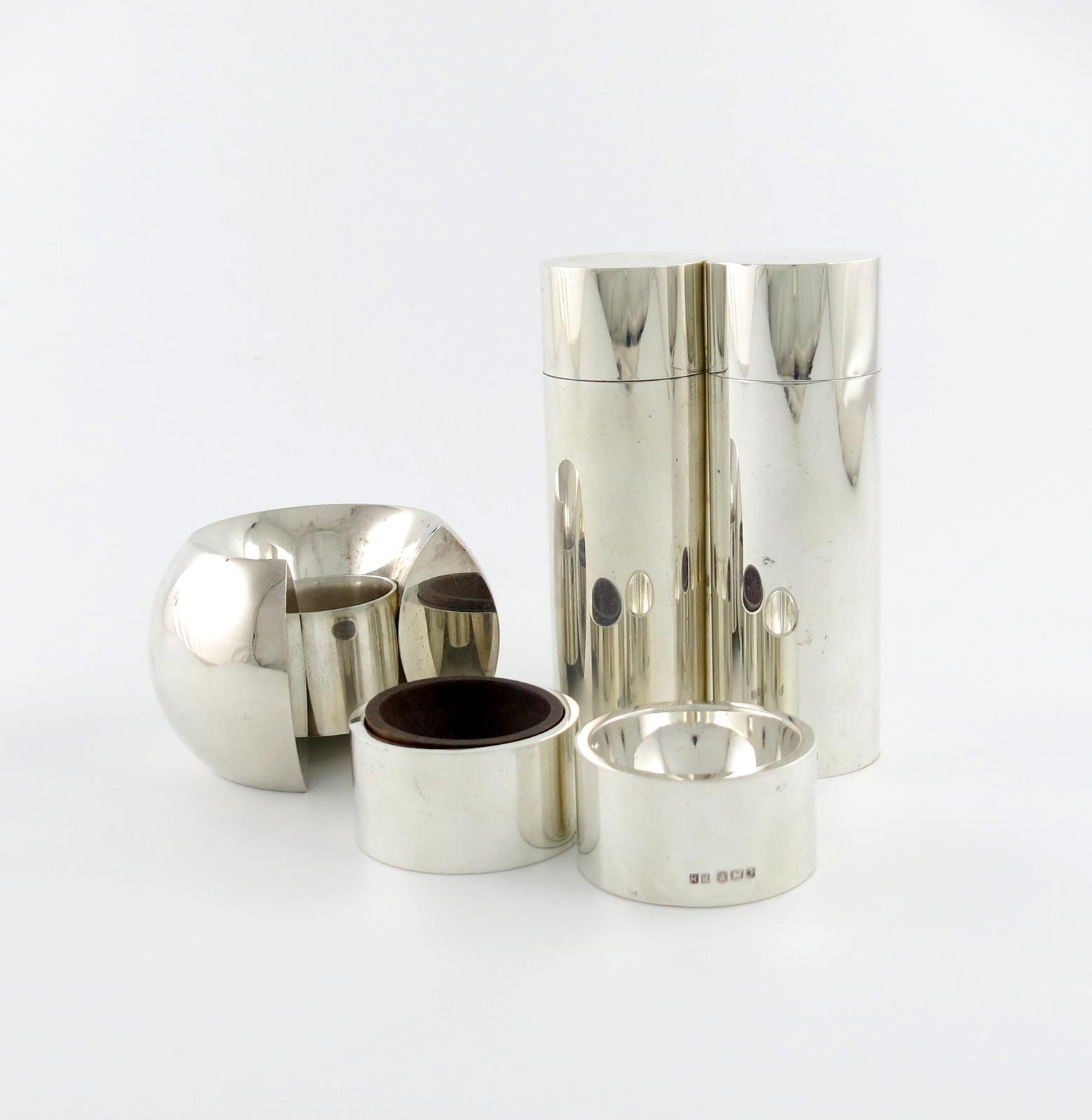 plain cylindrical form, the salt cellar with a wooden liner, plus a single candlestick, height of pepper mill 13.3cm, approx. weighable 12.5oz. (5)