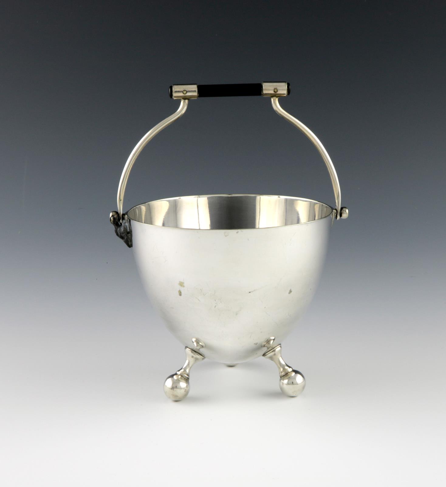 tapering circular form, the swing-handle with an ebony grip, on three ball feet, height with handle raised 17.5cm.