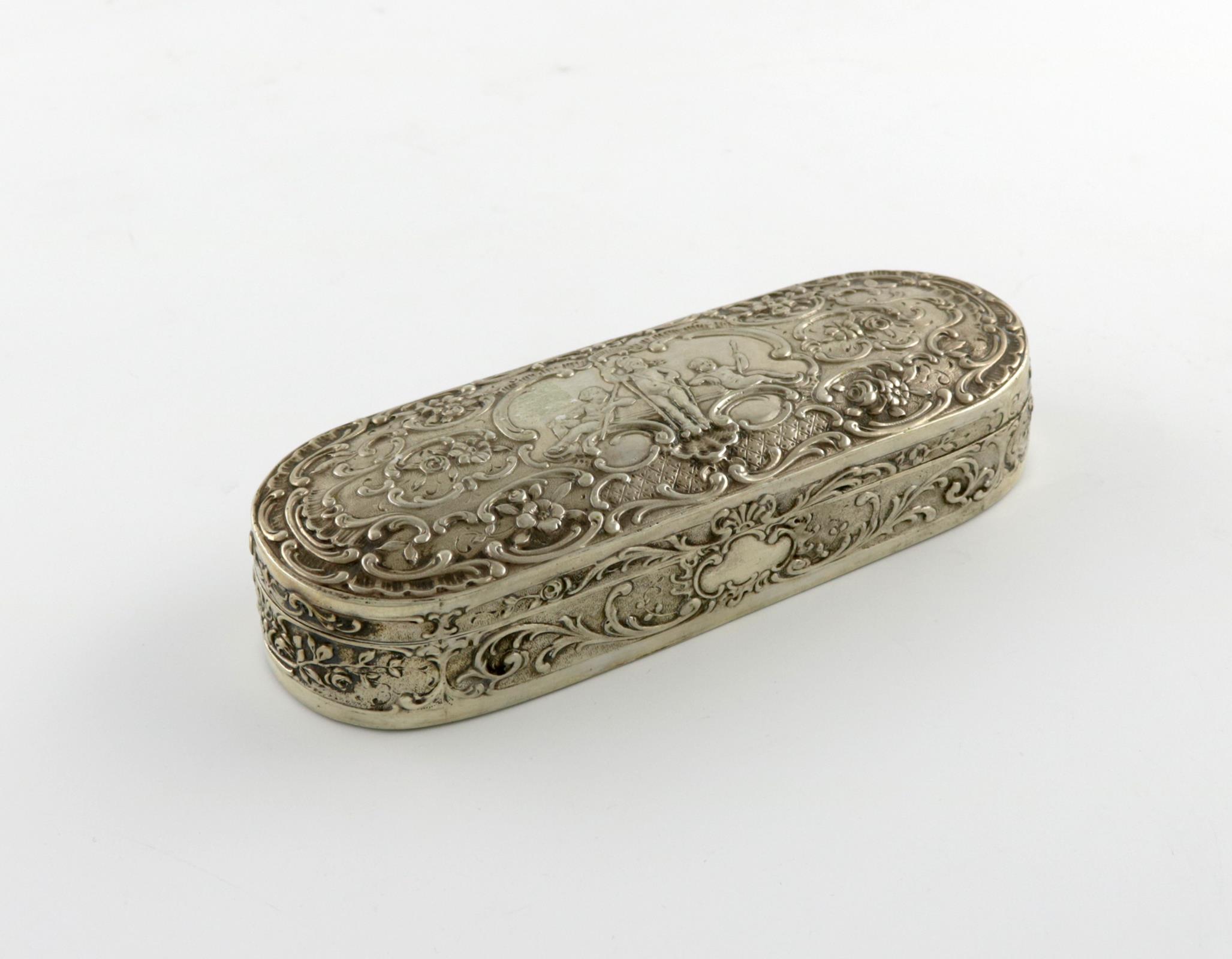 oblong form, embossed with figures and foliate scroll decoration, the front with a vacant cartouche, length 15.4cm, approx. weight 5oz.