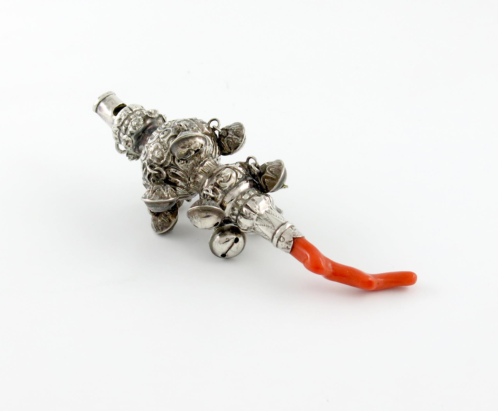 baluster form, embossed foliate decoration, with ten bells, a ring attachment, and a coral teether, length 13.8cm.