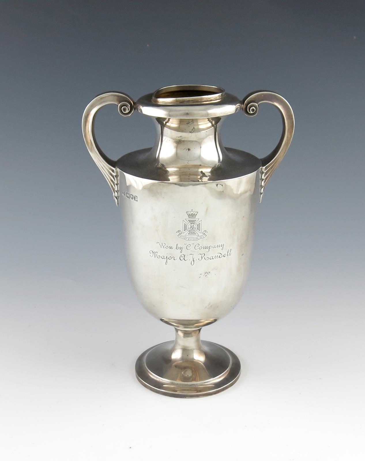 plain vase form, scroll handles, on a raised circular foot, inscribed with a Crowned H, above 'From the Viceroy, January 1916, Delhi' and 'won by ''C'' Company Major A.J. Randell', also with the badge of the 1/4 Bn The Wiltshire Regiment, height 24.5cm, approx. weight 20.5oz.