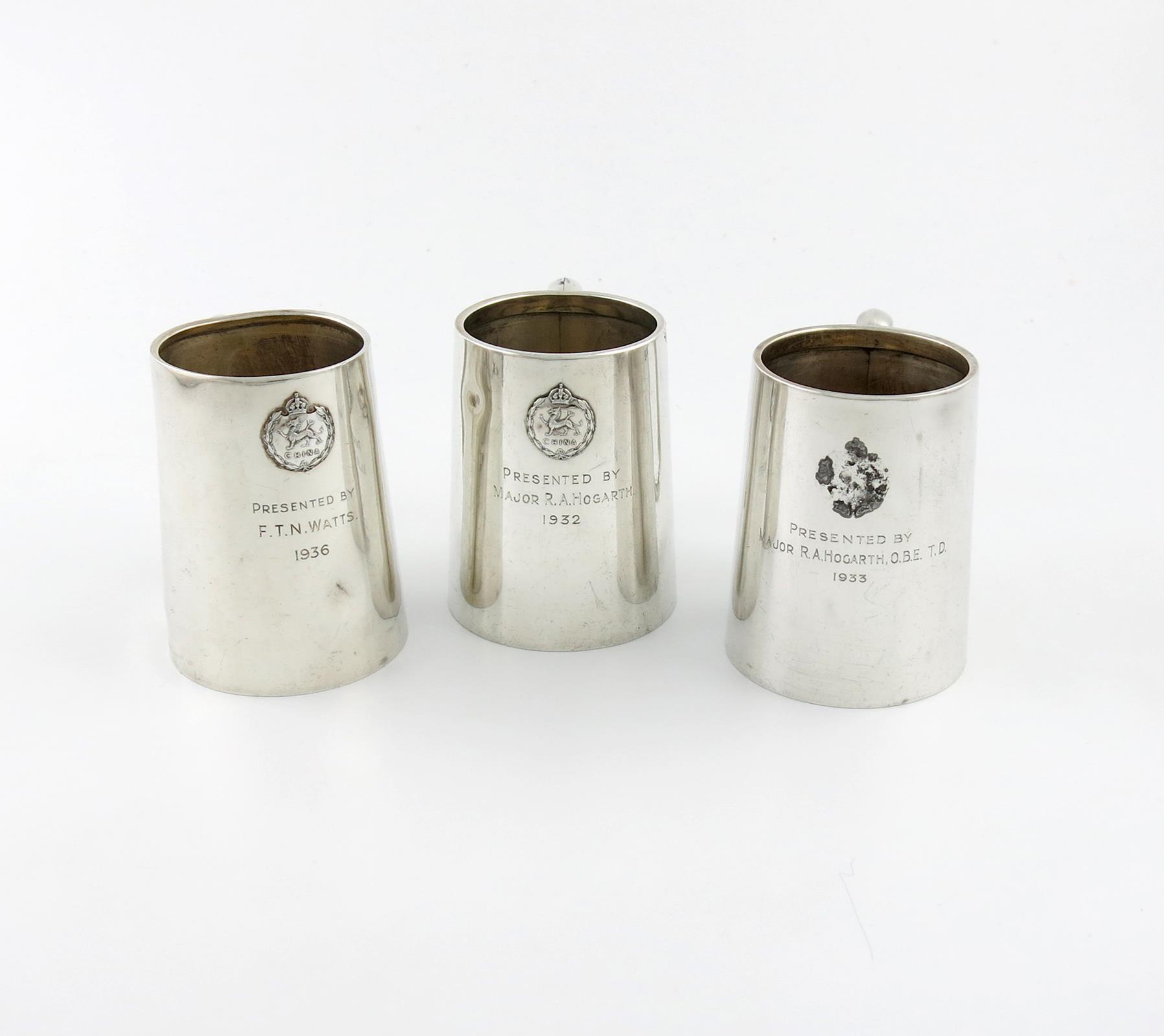 Three regimental silver mugs,