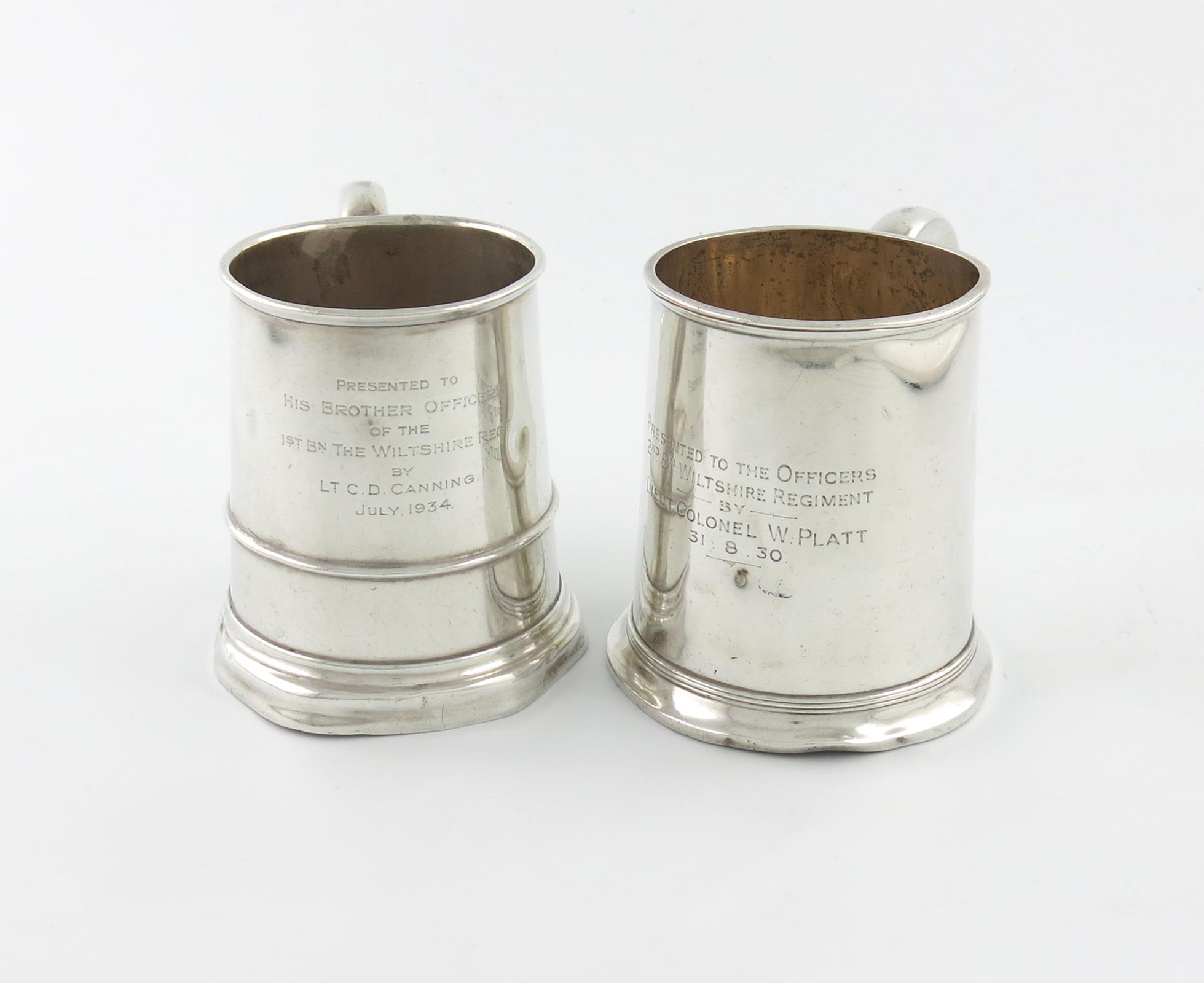 tapering circular form, scroll handles, inscribed with presentation inscriptions relating the 1st and 2nd Bn Wiltshire Regiment, approx. weight 23.5oz. (2)