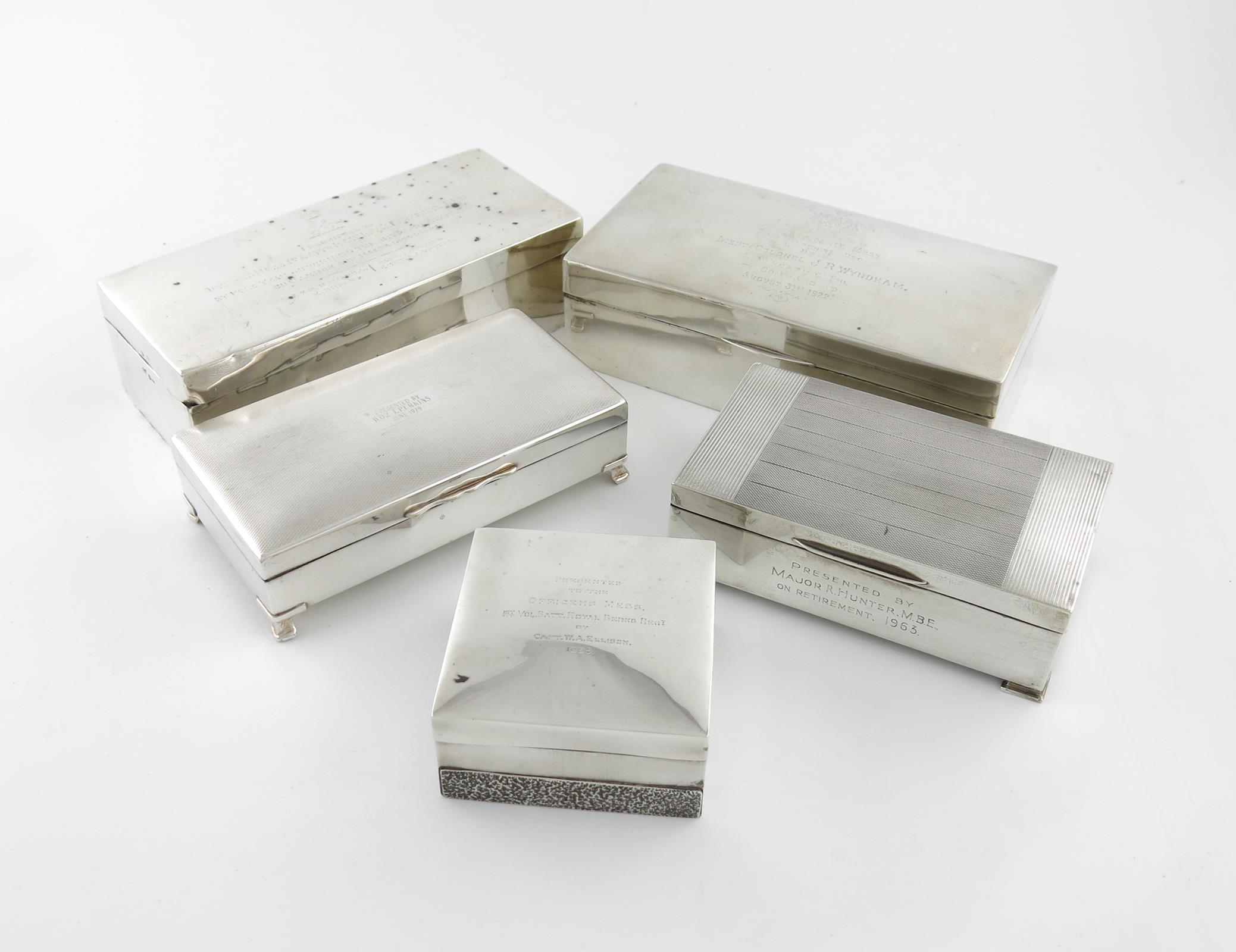 comprising silver ones: one by William Comyns, London 1895, square form, the front with a striker, plus two others and an unmarked metalware cigarette box, and an electroplated cigarette box. (5)