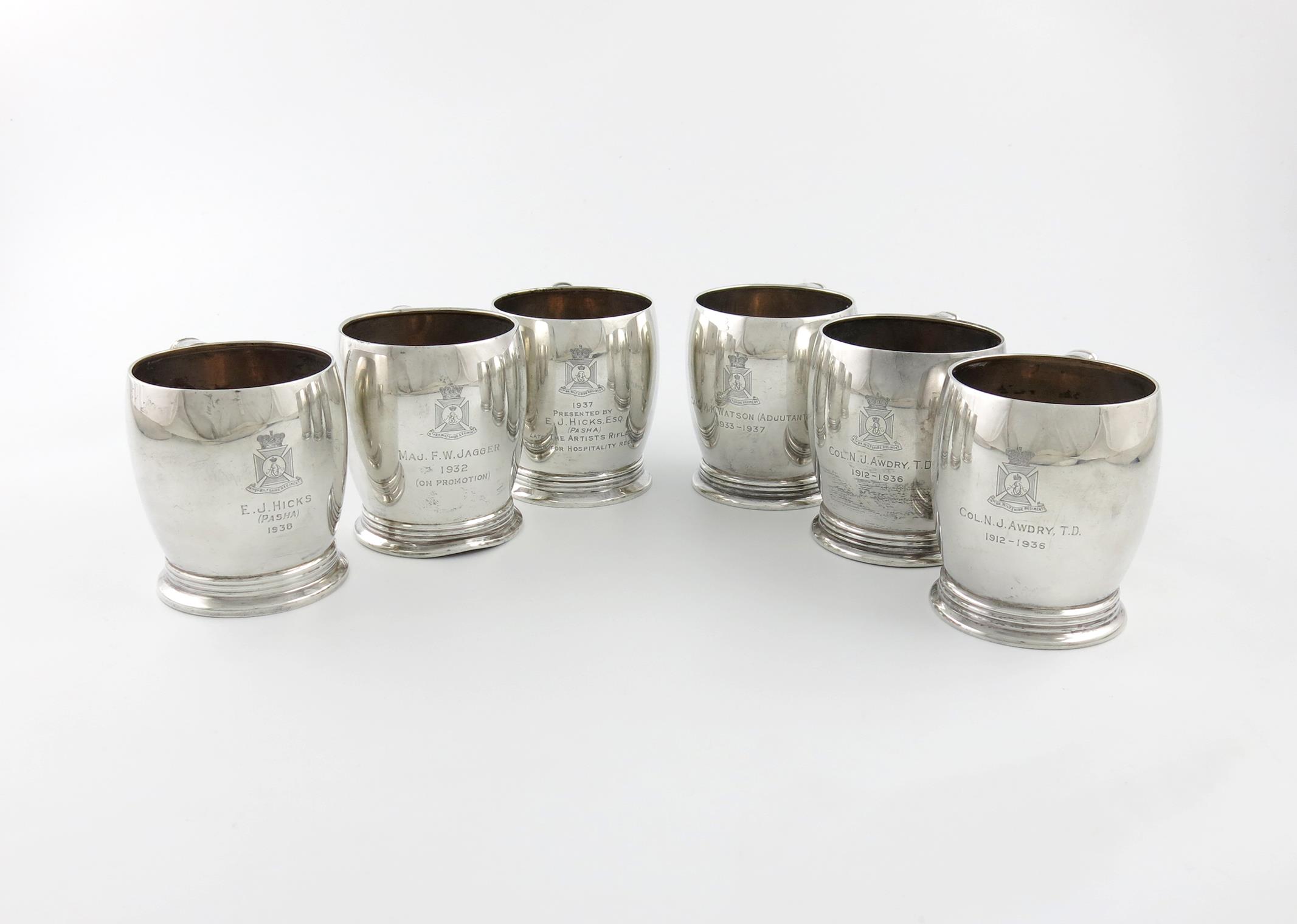 A set of six regimental Art Deco silver mugs,