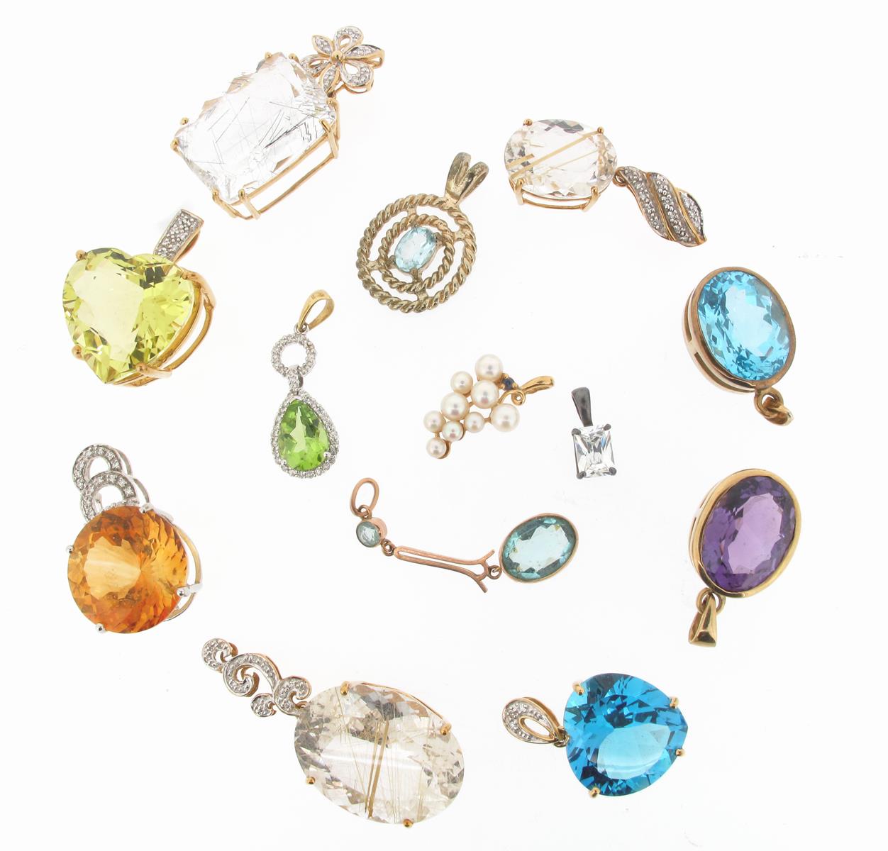 A collection of gem-set gold and silver mounted pendants including three rutilated quartz pendants, an amethyst pendant, a citrine pendant, two blue topaz pendants, with five other gem-set pendants and a blue stone set base metal pendant.