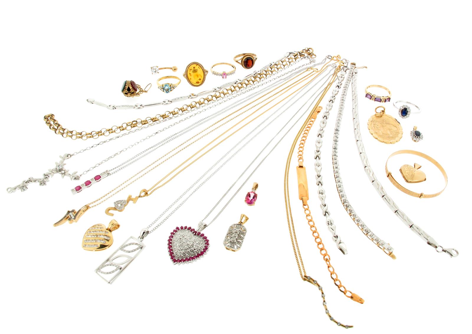 Assorted jewellery, including a sapphire and diamond cluster ring in 18ct white gold, an aquamarine and diamond seven stone ring set in 18ct yellow gold and four further gem-set rings in 9ct yellow gold. A 9ct gold spinning fob seal with carnelian, bloodstone and onyx matrices. A sapphire and diamond cluster pendant in 9ct gold and twelve other gold pendants with seven fine-link gold chains. A 9ct gold oval-link chain and five gold bracelets. A child's gold bangle and a white stone set navel bar. 88.0g in total.