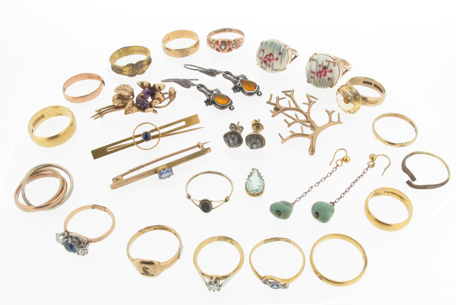 Assorted jewellery, including a sapphire and diamond three stone ring, size L 1/2. A diamond solitaire ring, A gold mourning ring with plaited hair. Two gold rings mounted with plaited hair. A sapphire mounted gold stick pin. A pair of silver earrings mounted with amber. A gold branch brooch. An amethyst-set foliate brooch. A gold signet ring, A pair of turquoise earrings, an aquamarine pendant, a pair of rose-cut diamond earrings, a sapphire bar brooch, a citrine ring, six plain gold wedding bands and four other gold rings.