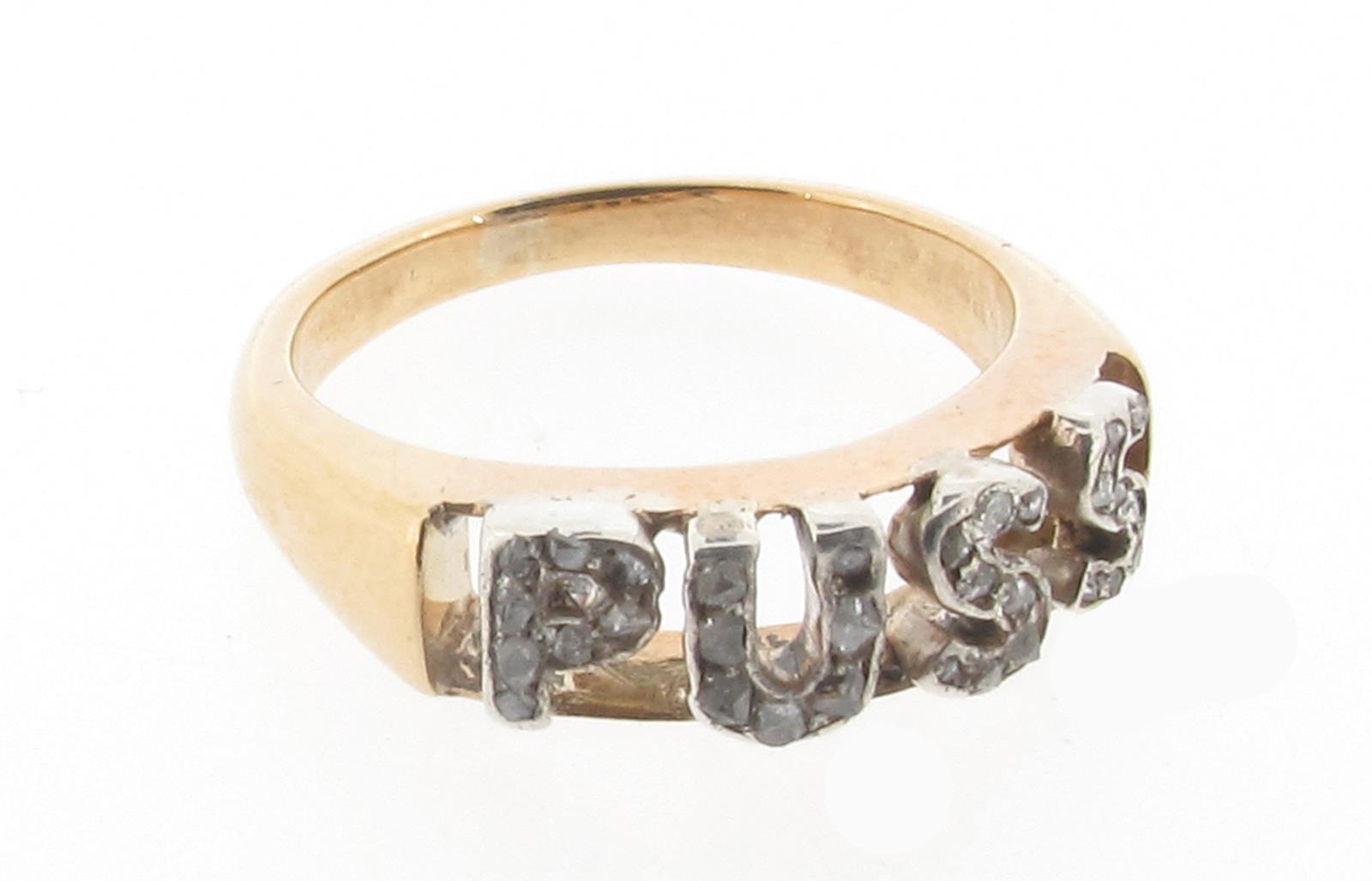A diamond-set gold ring, spelling the word 'puss'. Size D1/2.