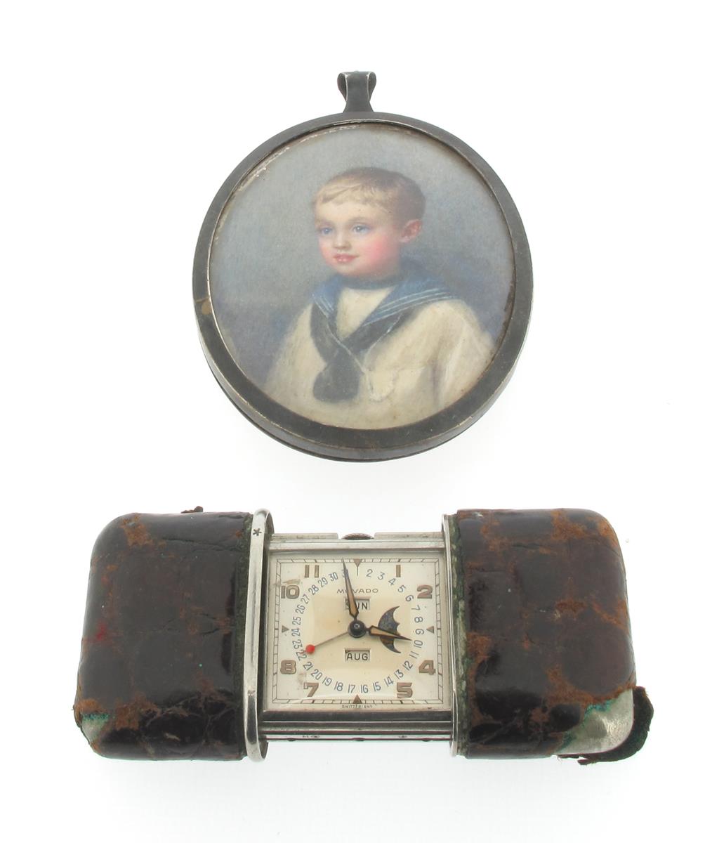 And a miniature portrait depicting a boy wearing a sailor's uniform. Silver frame. 6.5cm high.