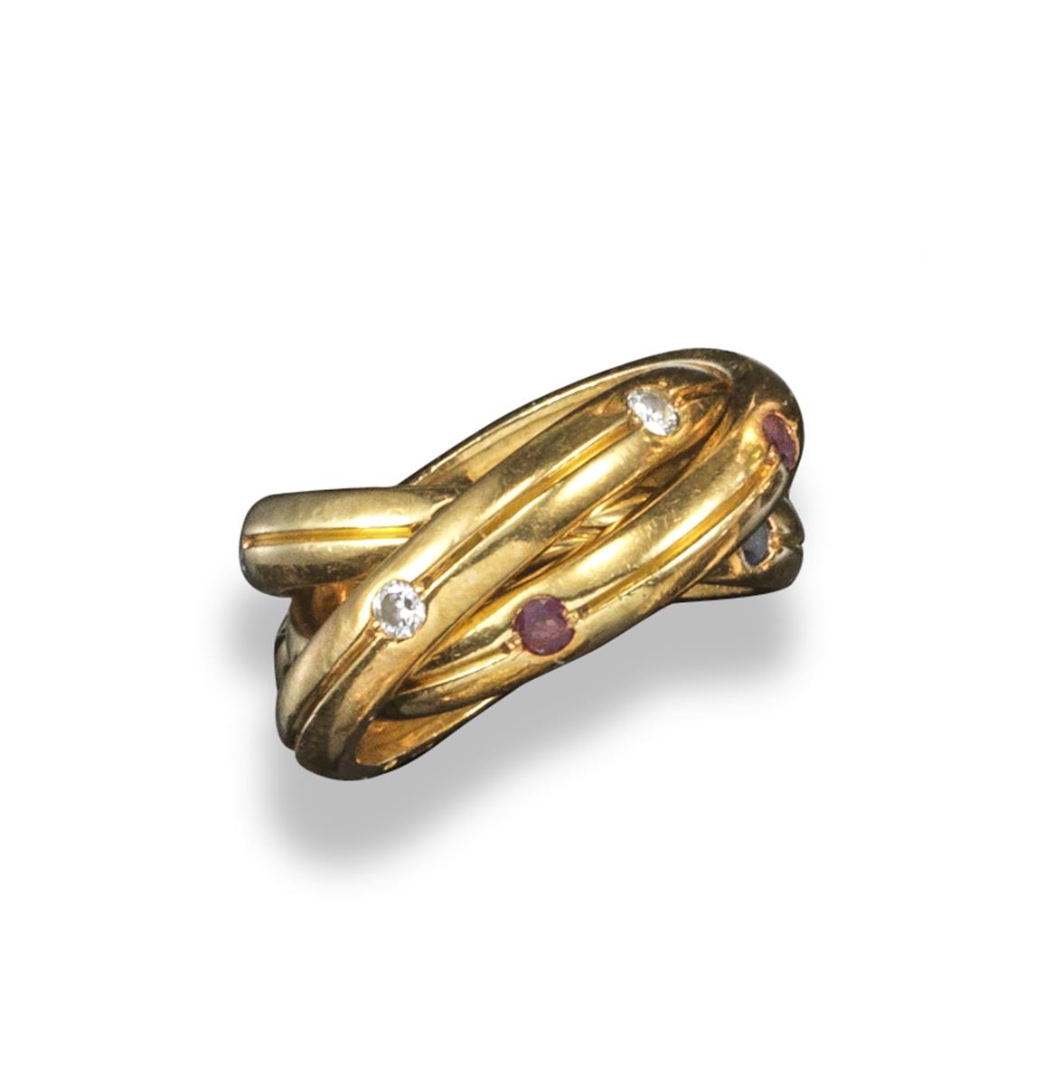 A ruby, sapphire and diamond set gold triple ring by Cartier, each of the three interlocking gold yellow gold rings set with either five circular-cut rubies, five circular-cut sapphires or five round brilliant-cut diamonds and with a central groove. Signed Cartier. Size L1/2.