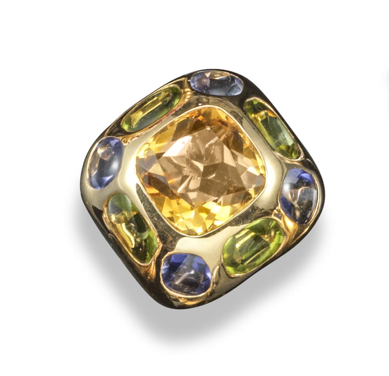 A gem-set dress ring by Chanel, set with a central cushion-shaped citrine within an alternating border of peridot and tanzanite cabochons in yellow gold bombé mount. French control marks and maker's lozenge B.A. Signed Chanel and numbered 1C4461. Size K 1/2. With Chanel pouch.