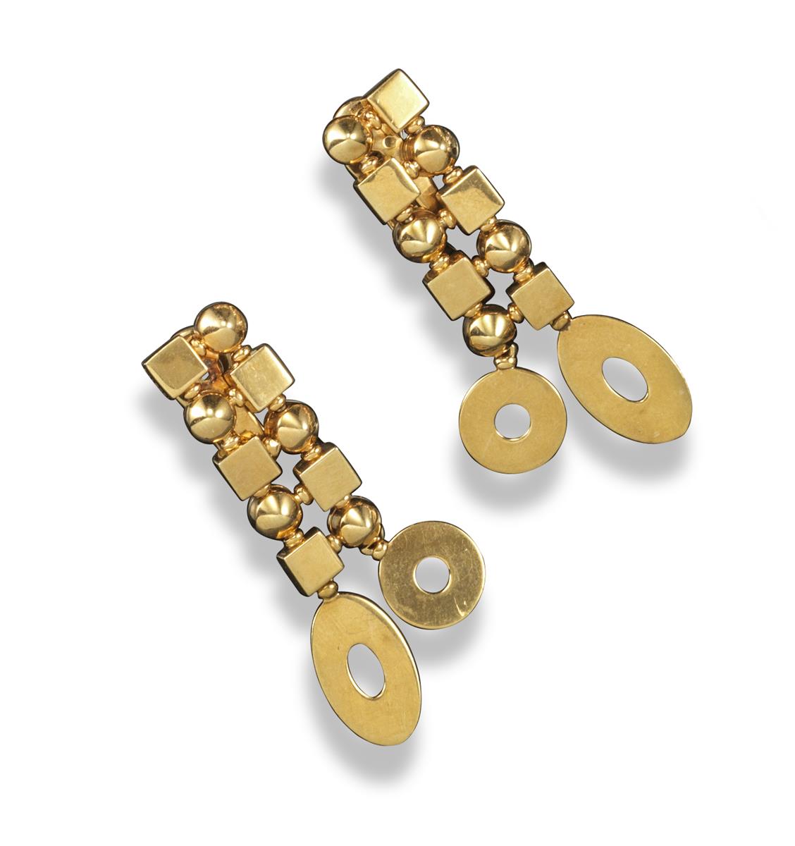 A pair of gold earrings by Bulgari, the articulated earrings designed as two lines of alternating square and circlular links joined with oval pellets and suspending a pierced oval and circle in yellow gold. Signed BVLGARI. 4.4cm high.