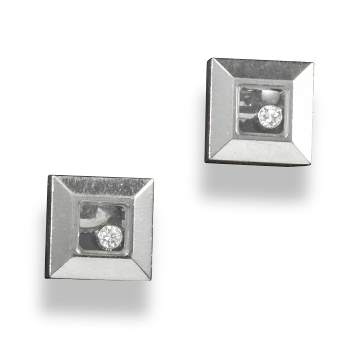 A pair of Happy Diamond earrings by Chopard, the bevel-edged square-shaped earrings in white gold and centred with a square-shaped glazed compartment containing a 'floating' round brilliant-cut diamond. Signed 'Chopard' to the glass and the reverse. 1.0cm high.