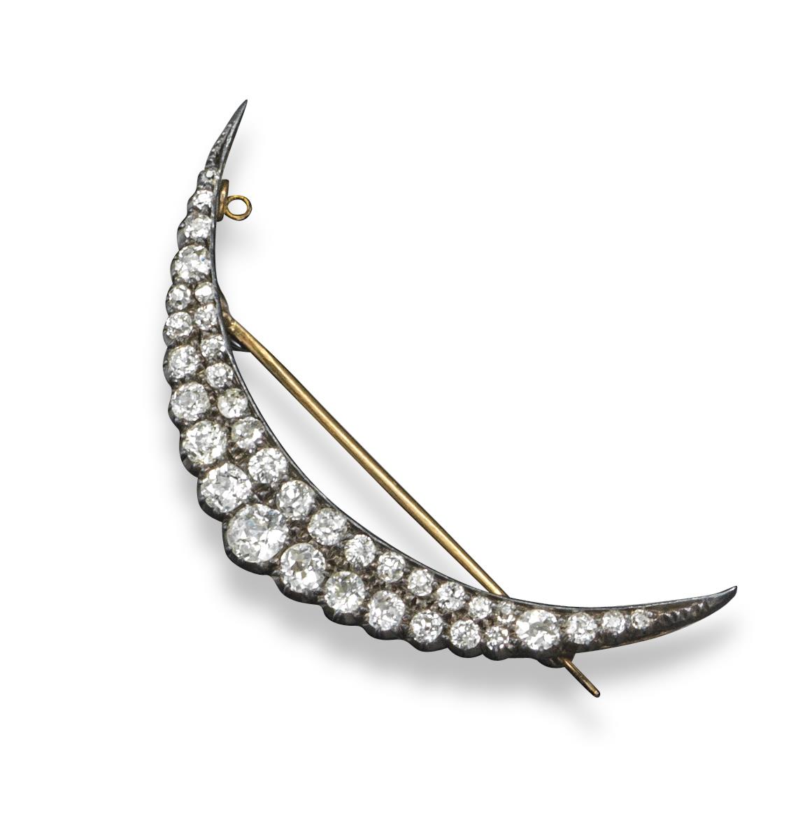 A late 19th century diamond crescent brooch, the open crescent is set with two lines of graduated old circular-cut diamonds in silver and gold. 5.1cm wide.