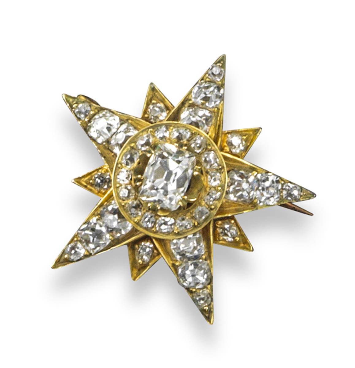 A Victorian gold star brooch, set with an old mine cut diamond set within borders of graduated old cushion-shaped diamonds in yellow gold. Fitted case.
