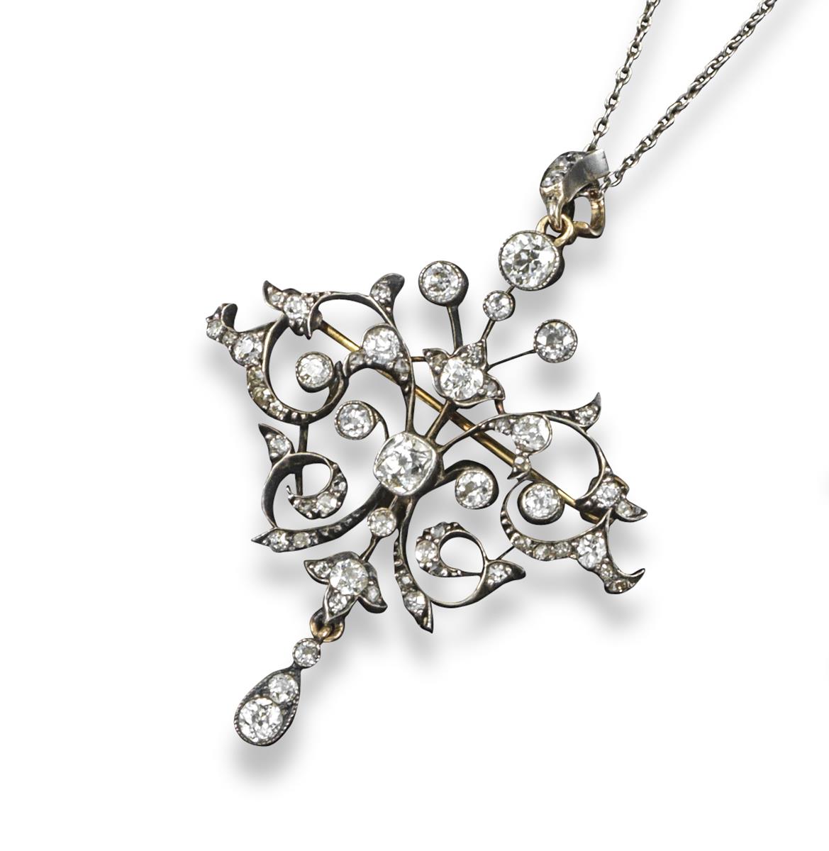 A late Victorian diamond brooch pendant, of scroll form and set with graduated cushion-shaped and circular-cut diamonds in silver and gold. With diamond-set bale. The pendant 5cm long. On fine link neck chain. Fitted case.