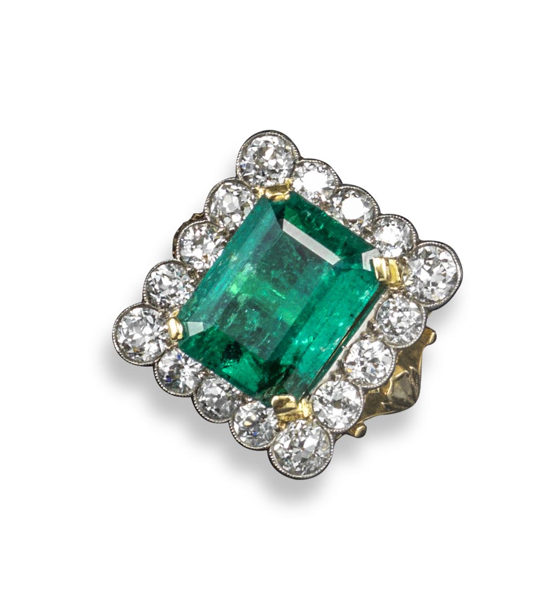 A French emerald and diamond cluster ring, the emerald-cut emerald weighs approximately 11.00cts and is set within a surround of sixteen old circular-cut diamonds in platinum and gold. French control marks. Size P 1/2.