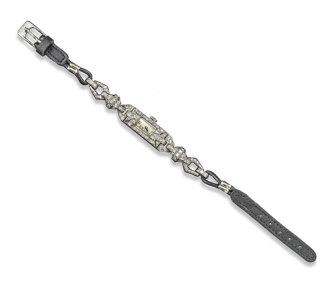 A French diamond and platinum dress wristwatch, the rectangular dial with black Arabic numerals and set overall with graduated circular-cut diamonds. Leather band. Case.